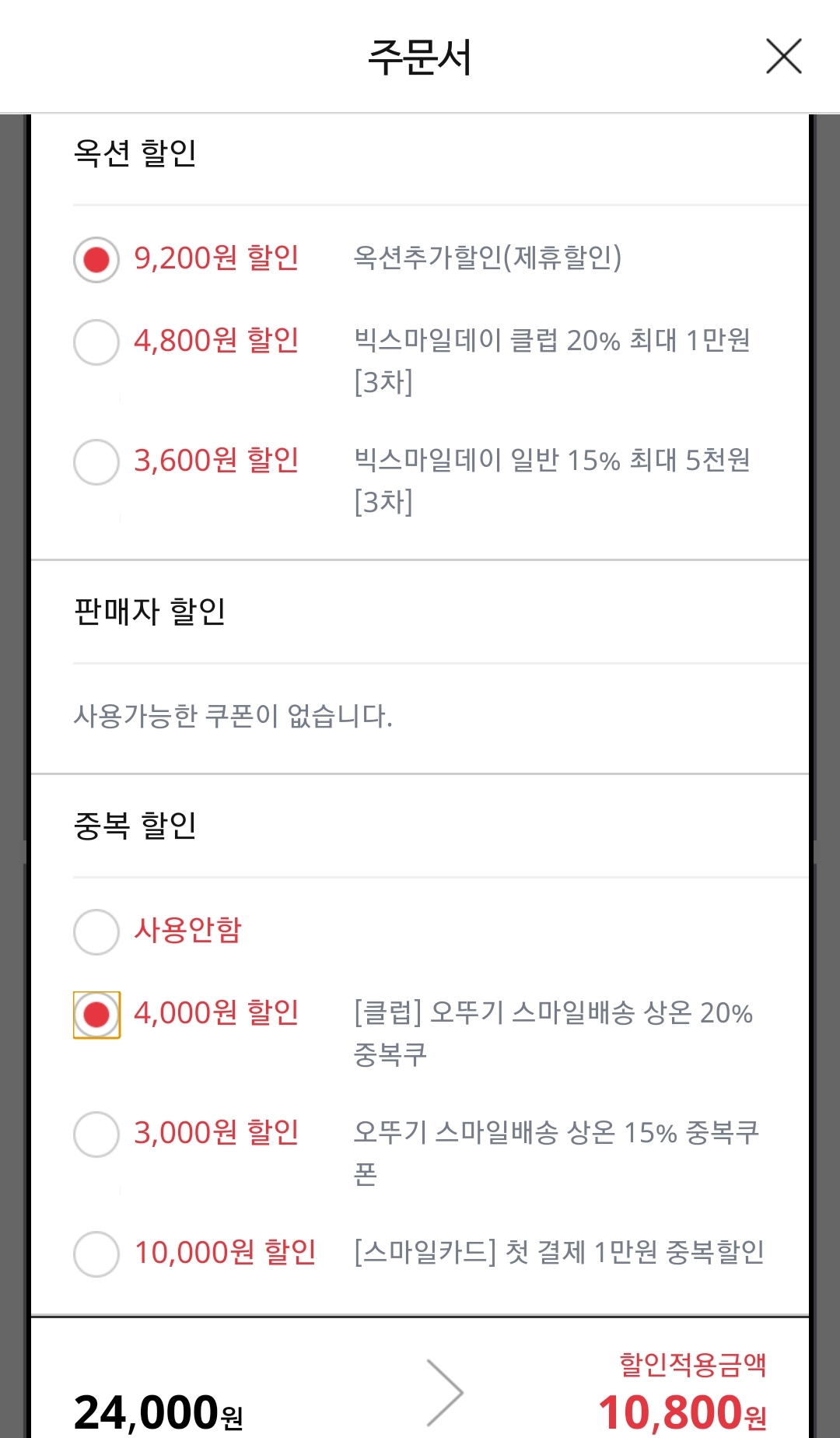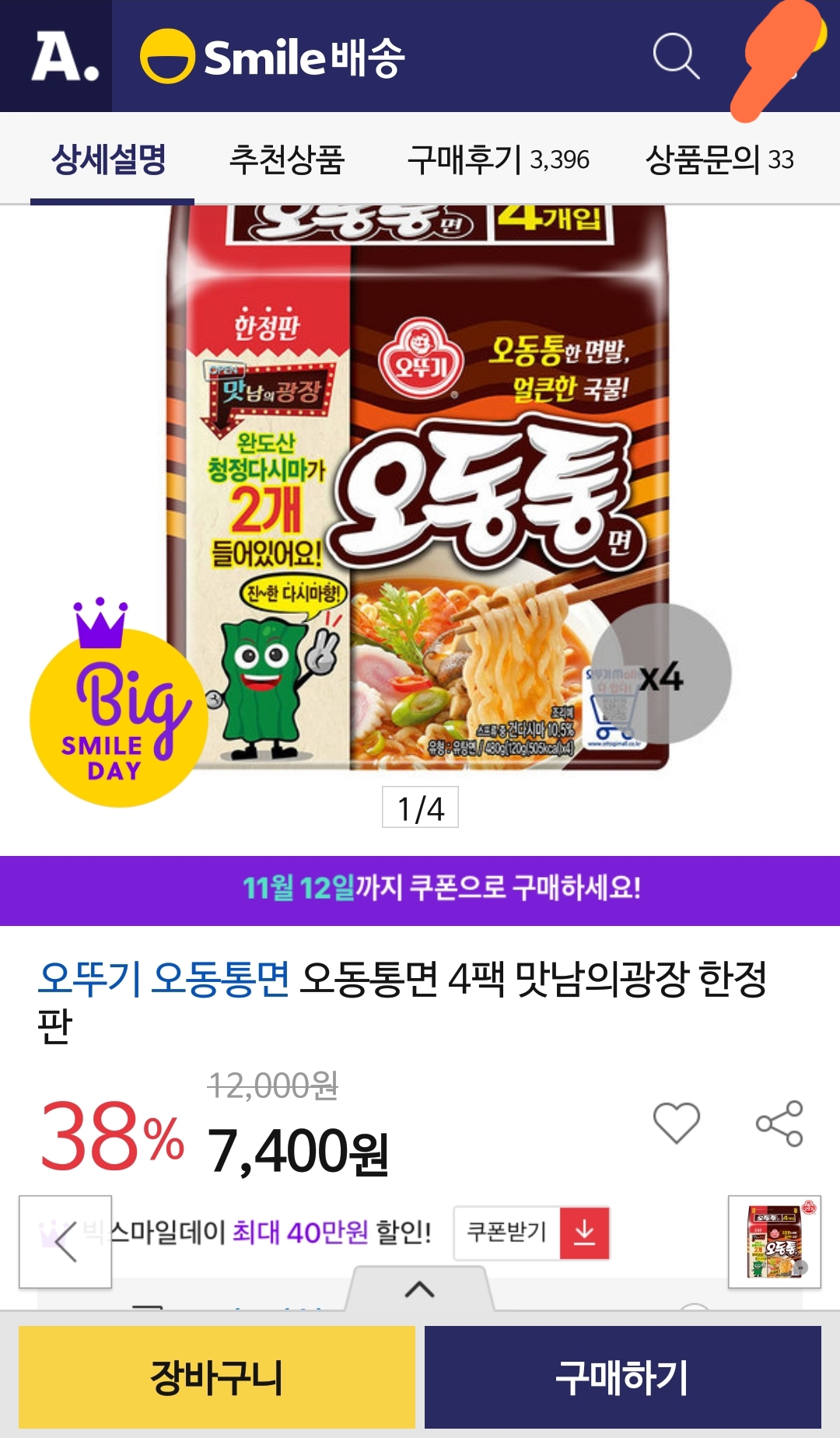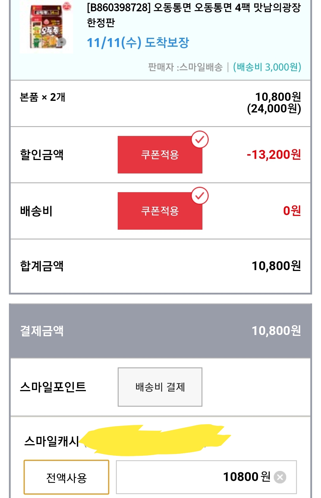 스마일클럽 회원용 가격. 빅스마일데이쿠폰은 필요없고, 오뚜기 중복할인쿠폰과 스마일배송 무료쿠폰을 사용. 32봉 할인가 10800원으로 개당 338원꼴. 스마일캐쉬 결제가능.
