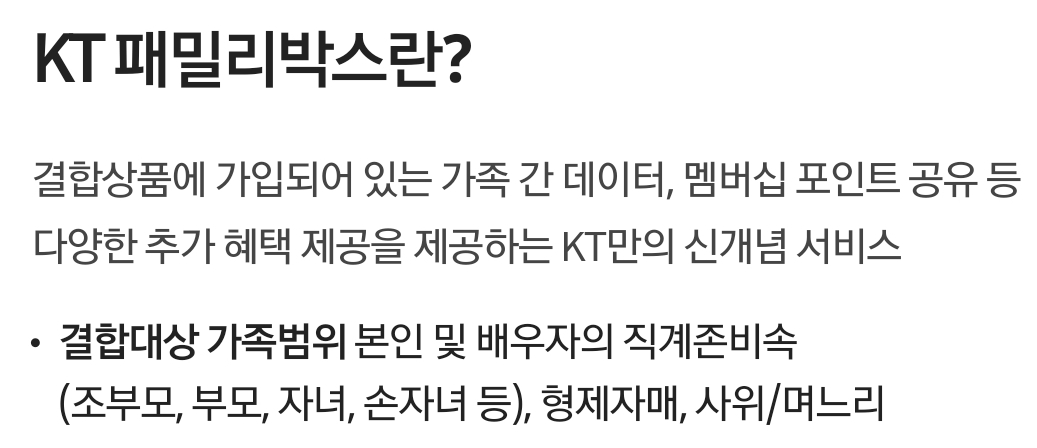 KT 패밀리박스란? 결합상품에 가입되어 있는 가족 간 데이터, 멤버십 포인트 공유 등 다양한 추가 혜택 제공을 제공하는 KT만의 신개념 서비스 결합대상 가족범위 본인 및 배우자의 직계존비속(