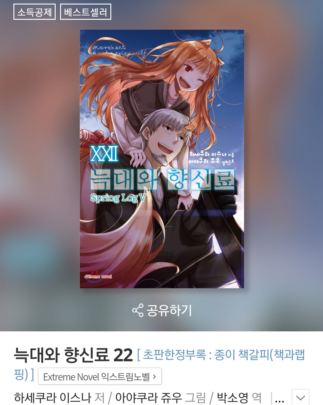 늑대와 향신료 22 .. 다섯 권째 후일담이라고. 이번 출간 목록 중 가장 거물이네. 본편이 너무 길어서, 1권과 막권만 읽고 후일담을 읽는 데서 정주행을 시작한다면? 이런 생각이 드는데.. ㅡ.ㅡ 16권으로 완결됐다고 아는데 22권이 후일담 5권이라, 보니 보충 겸 단편으로 17권이 따로 있었네.
