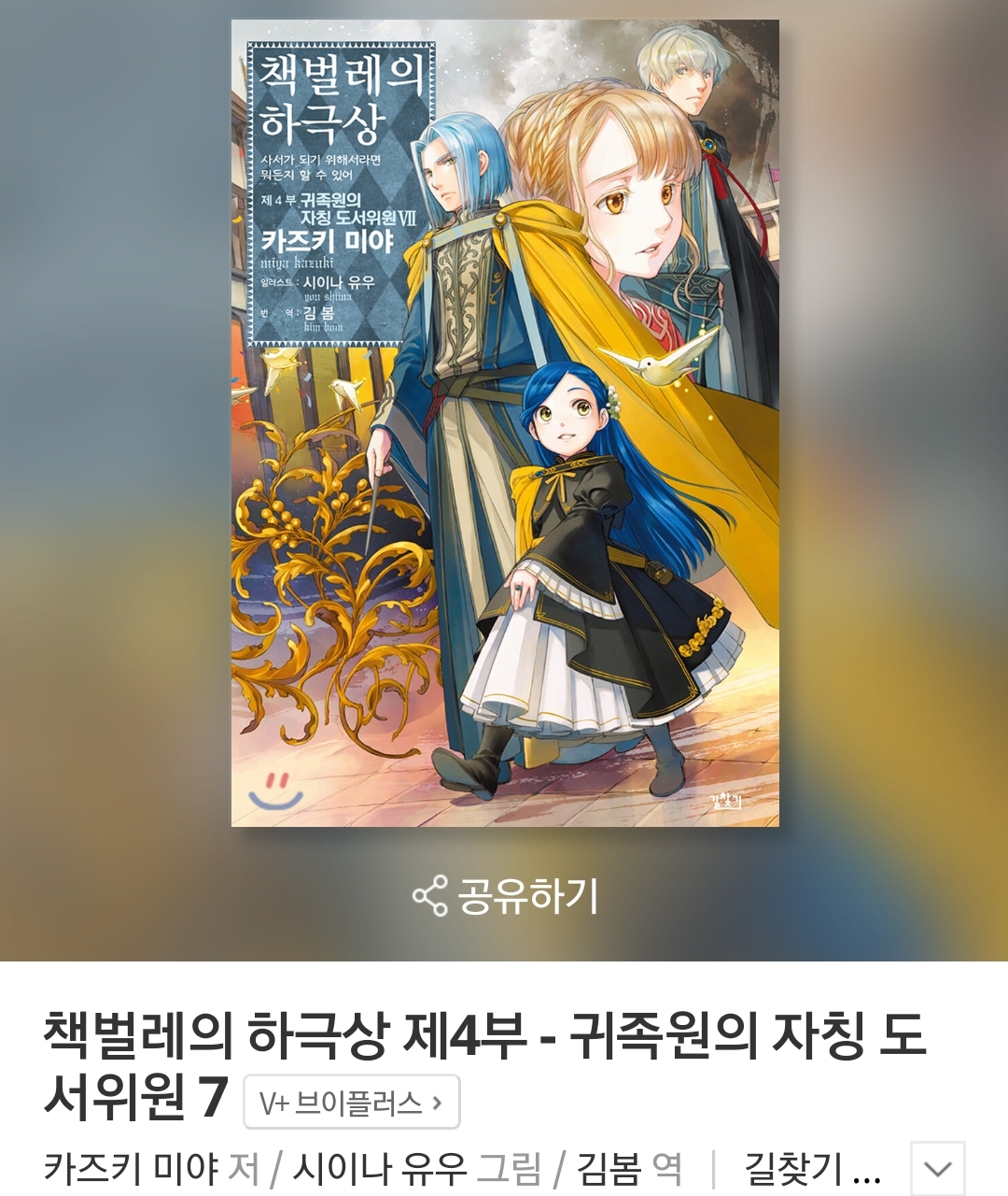 책벌레의 하극상 4부 7권.. 1부부터 세면 3+4+5+7= 19권째네. 책 진도는 2학년을 마치는 데까지. 갈 길이 멀다. 일판도 3학년만 마친 모양이기는 하지만.