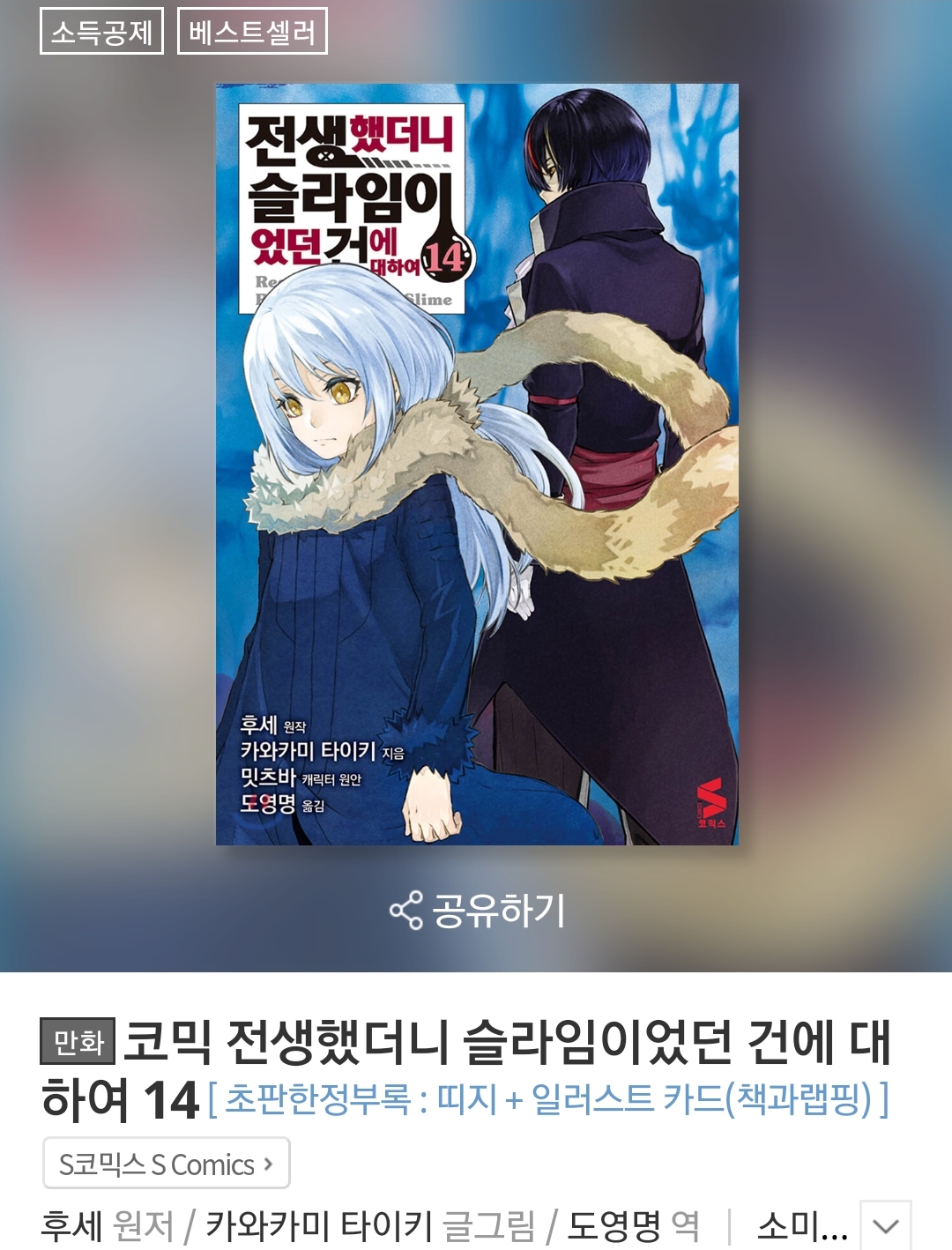 전생했더니 슬라임이었던 건에 대하여 14.. 책소개를 보니 내년에 애니메이션 2기가 나온다네. 책은 모르겠고 애니만 관심간 타이틀.