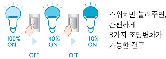 스텝디밍전구는 10와트짜리를 사면 스위치를 빠르게 껐다 켜면 다음에는 차례로 6와트, 3와트식으로 밝기가 바뀌는 전구입니다. 밝기정도는 제품마다 다릅니다.