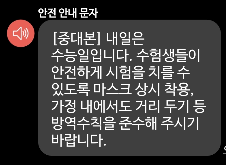 내일 대입수학능력시험을 앞두고 보낸 중대본 문자를 보고