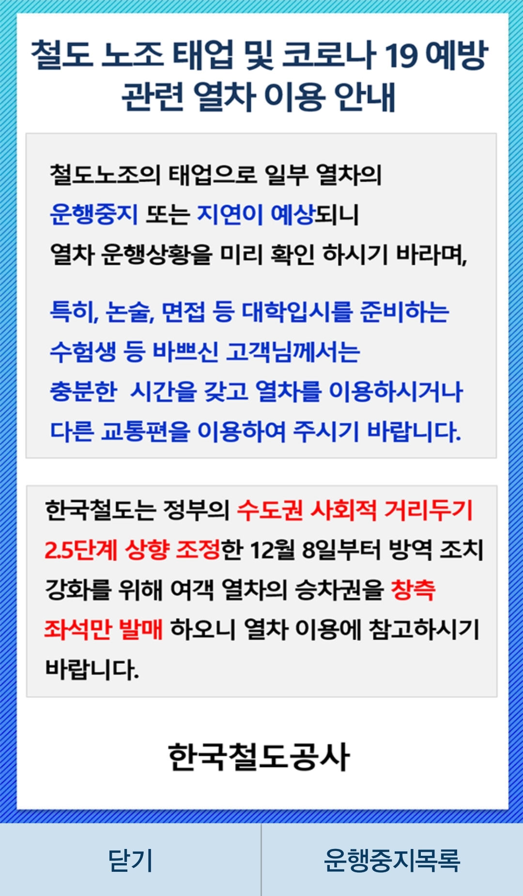 지금 저 공지와 같은 이유로 운행편수가 줄거나 편당 객차수가 줄기도 한 느낌인데, 여기에 이번주부터 코로나19관련 조치가 추가돼서 기차 좌석예약은 미리미리 하는 게 좋습니다.