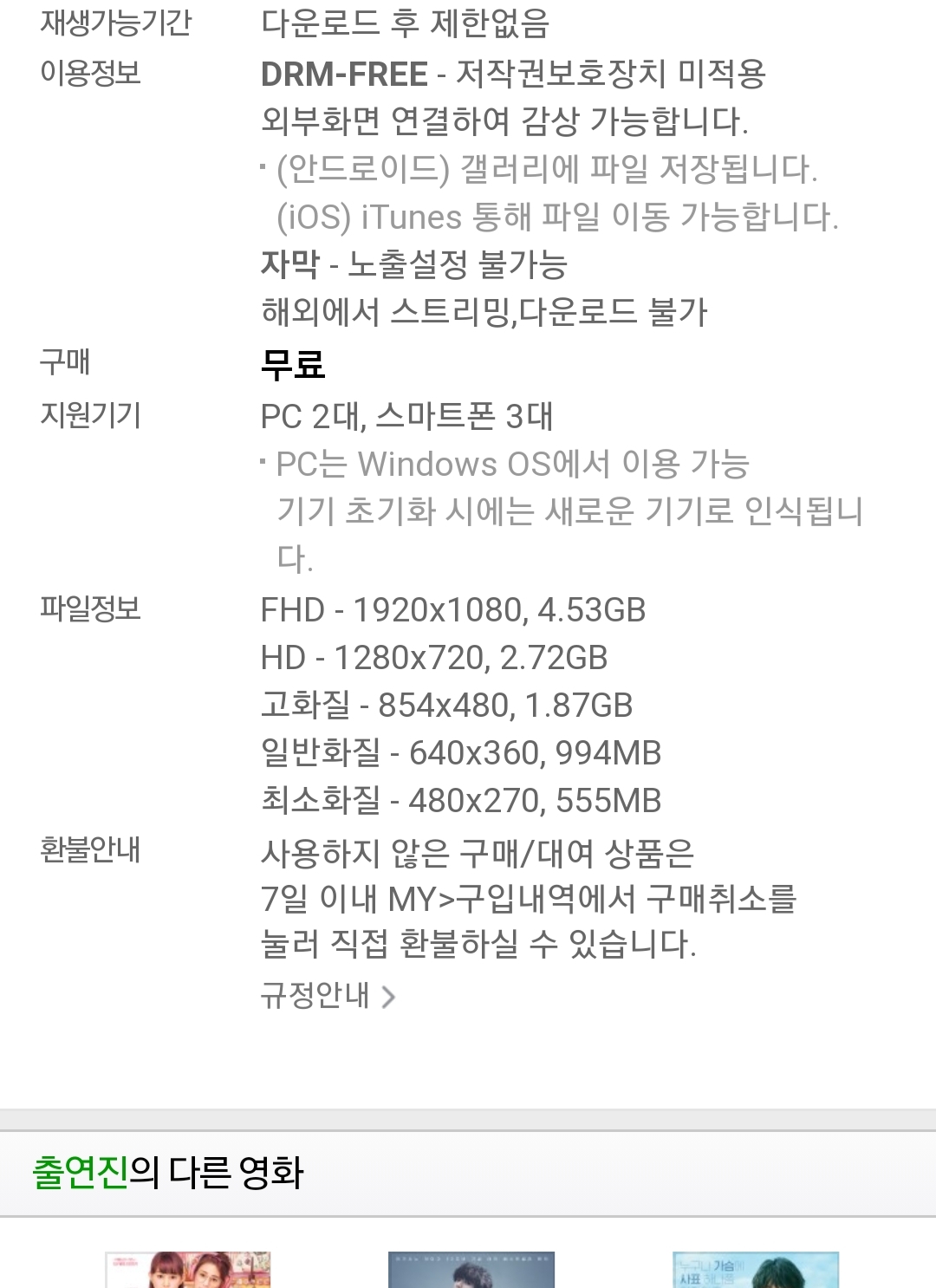 금주의 무료영화입니다. 대여는 기간내 대여(다운로드+시청), 구매는 구매하고 기간내 받아두고 언제든 보셔도 됩니다. 주말의 비디오대여점 느낌이군요. ^^