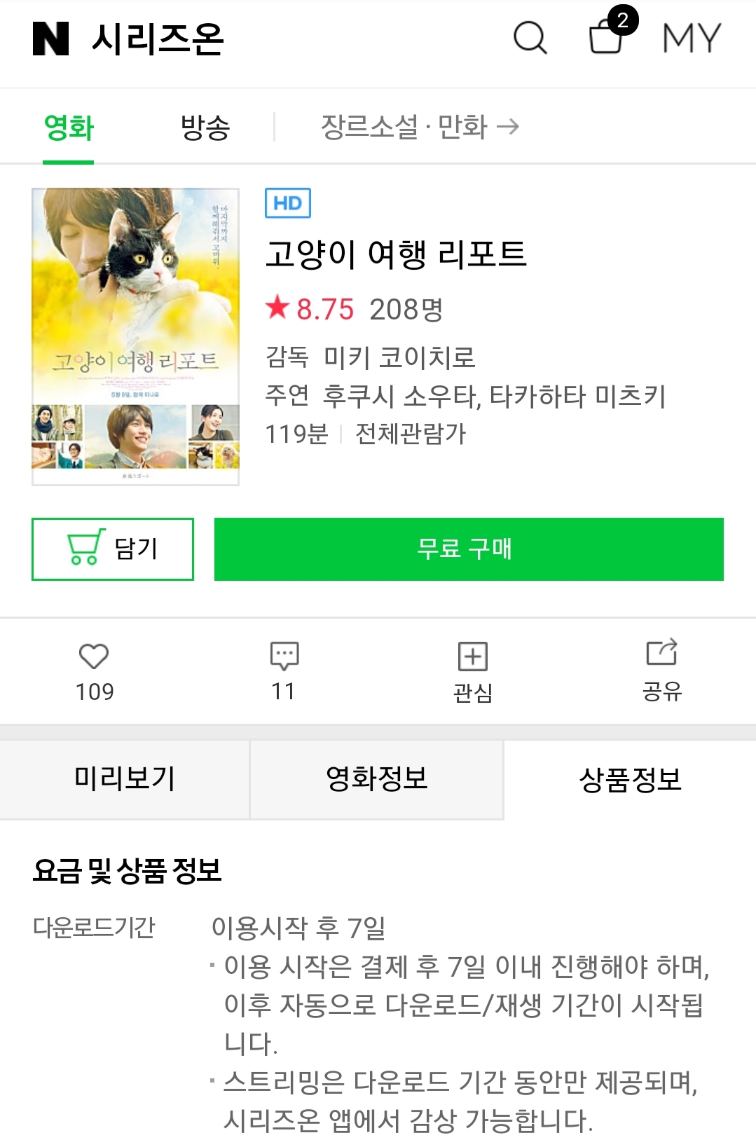 (네이버 시리즈온 무료영화) 비틀스, 왓 위민 원트, 고양이 여행 리포트 등 본문