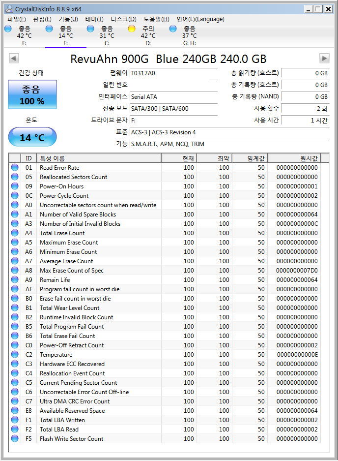 그냥 싼 값에 어울리는 제품이란 느낌인데, 인식불량이나 프리징없이 오래 오래 쓸 수 있기만을 바란다. 사실, 업무용이나 홈컴퓨터에 사용하는 저가 보급형 ssd에 바라는 건 그거쟎아? 좀 느려도 어차피 하드디스크보단 훨씬 빠르고 억세스타임은 빠르니까, 최고전송속도는 느려도 좋으니까 5 그 대신 신뢰성(고장률, TBW 등)에 신경써달라는 거. 6