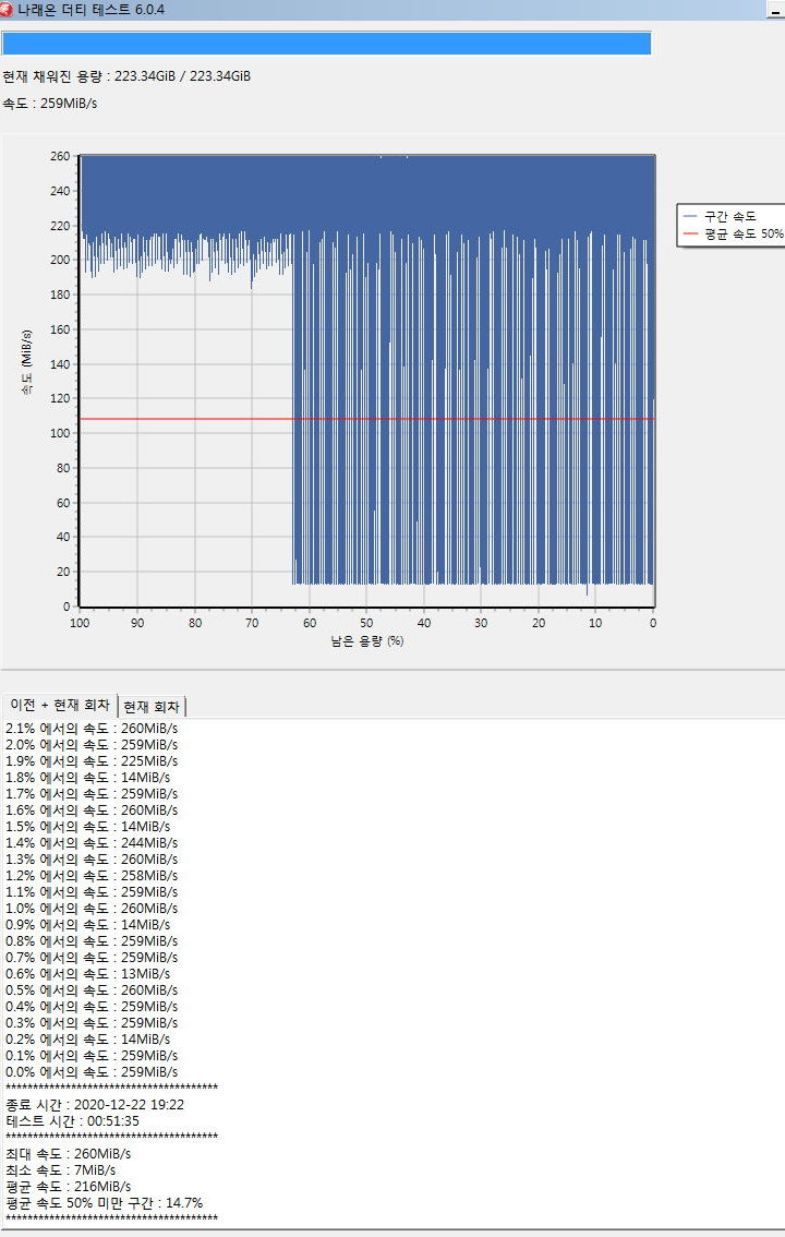 약 1/3을 지나는 시점에서 속력이 들쭉날쑥해지며 20MB/s가 못 되는 구간이 많다. 이게 끝까지 간다. (SATA3포트에 물리면 좀 다를까? 그건 모르겠다. 기회가 되면 다음에 또 올리겠다)