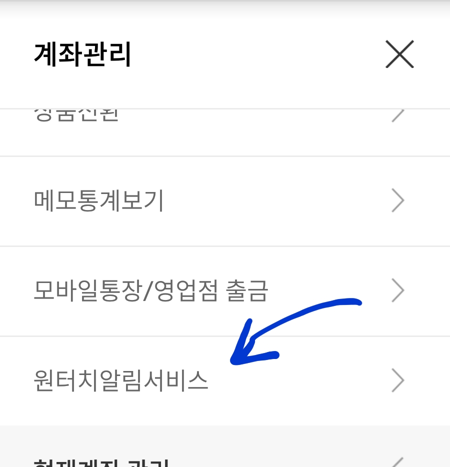 입출금계좌를 터치해 상세정보보는 화면으로 간 다음, 화면 우상단 삼점버튼을 눌러 계좌관리 메뉴 호출.