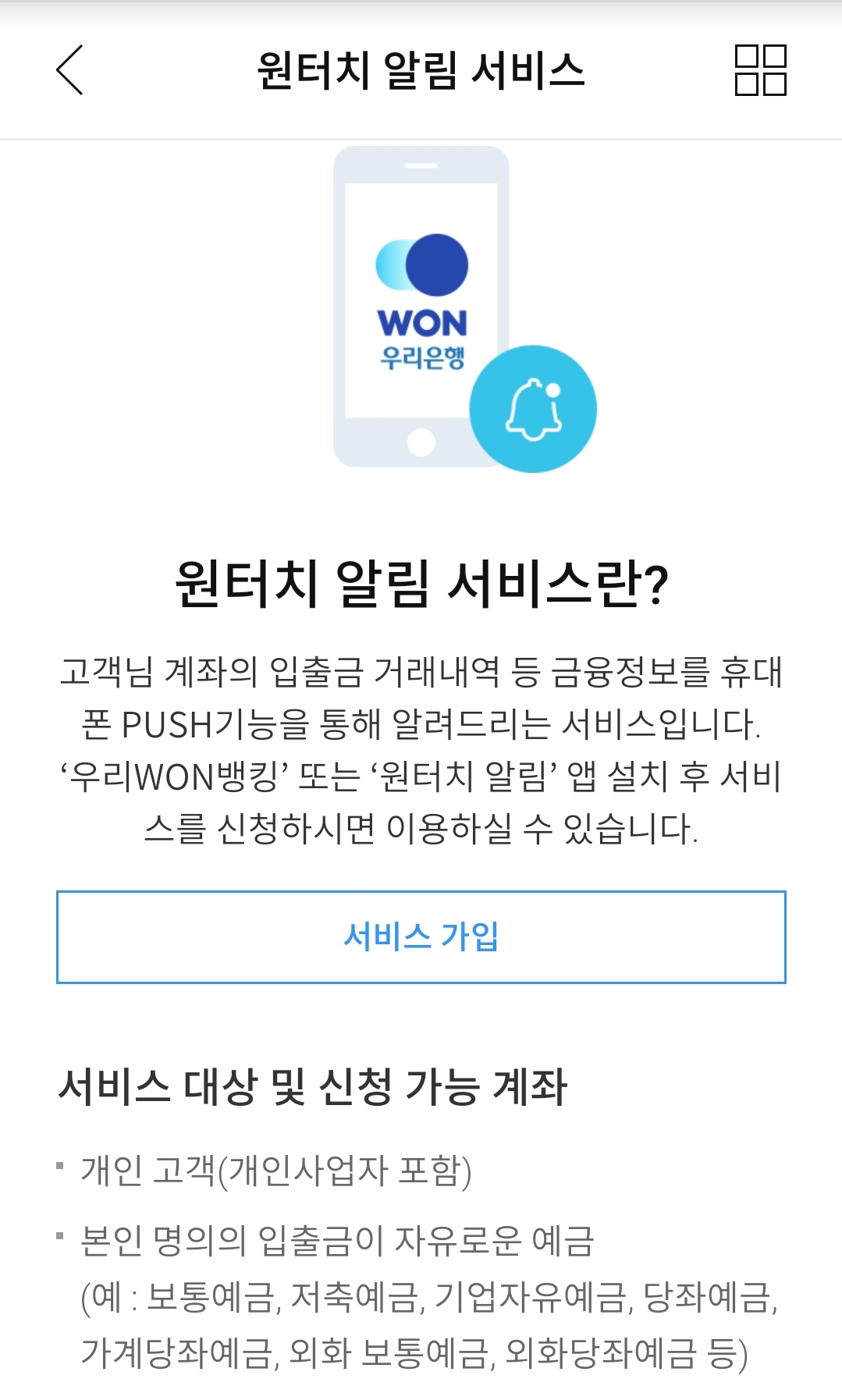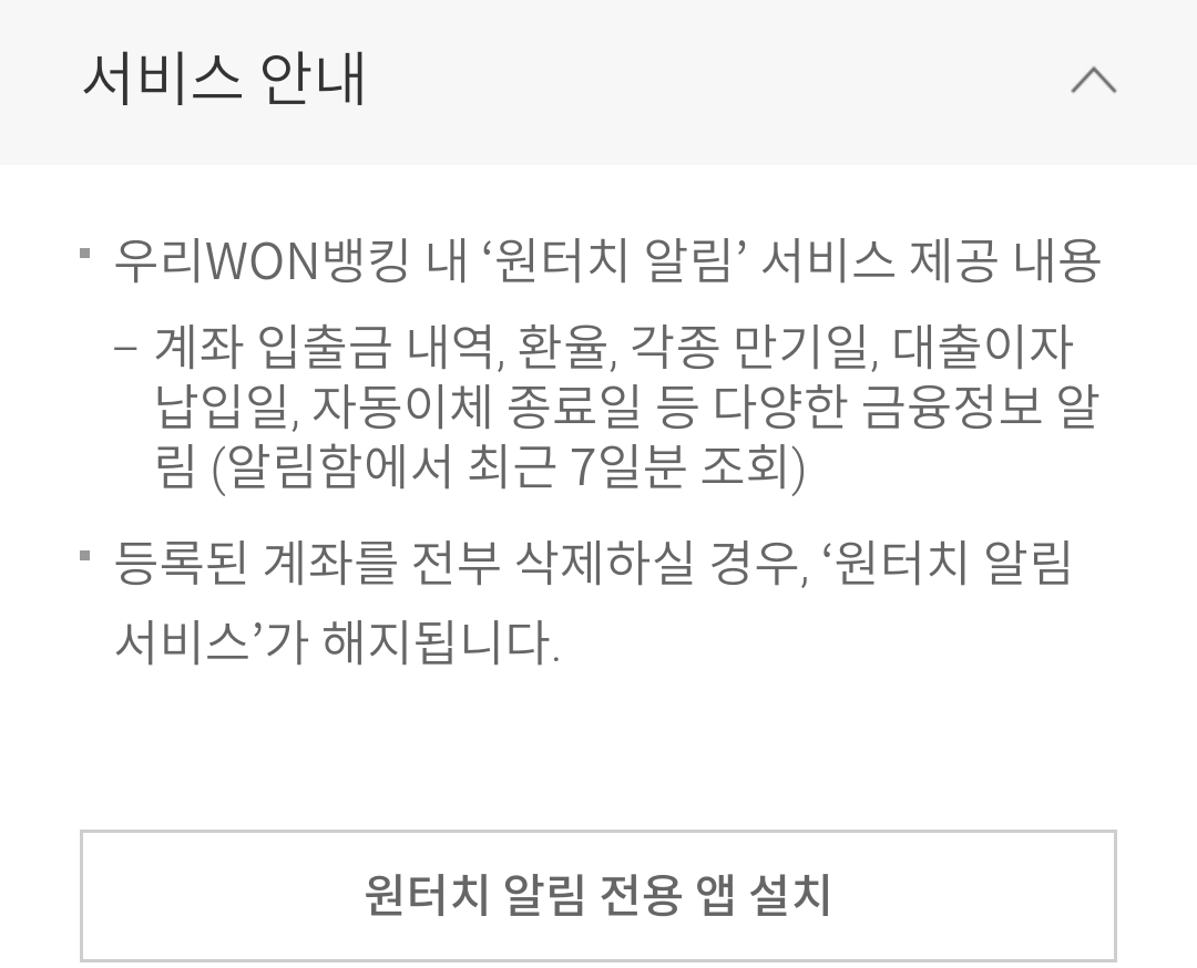 알림 전용 앱을 깔아 쓸 수도 있지만, 그거 안 깔고 그냥 기본 인터넥뱅킹(우리 WON 뱅킹) 앱으로도 가능.