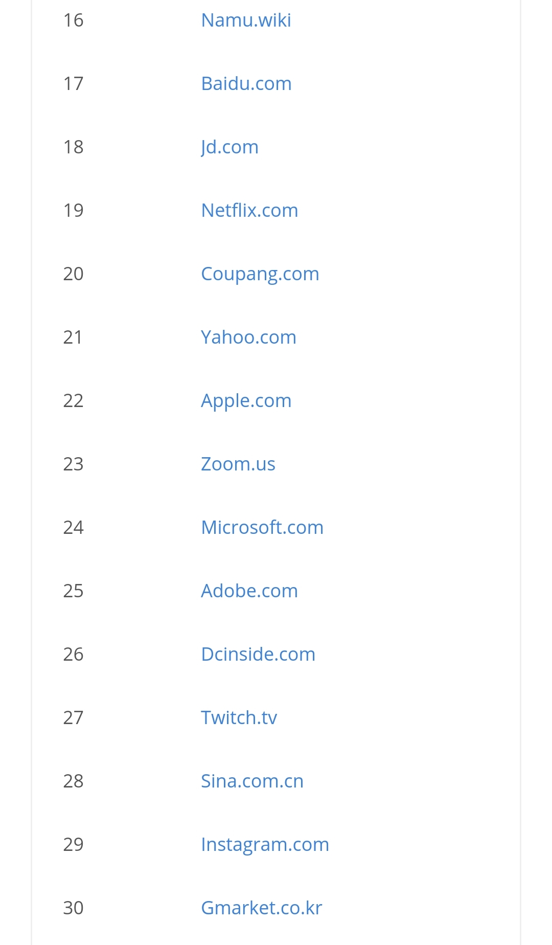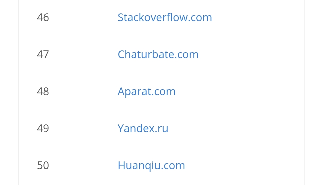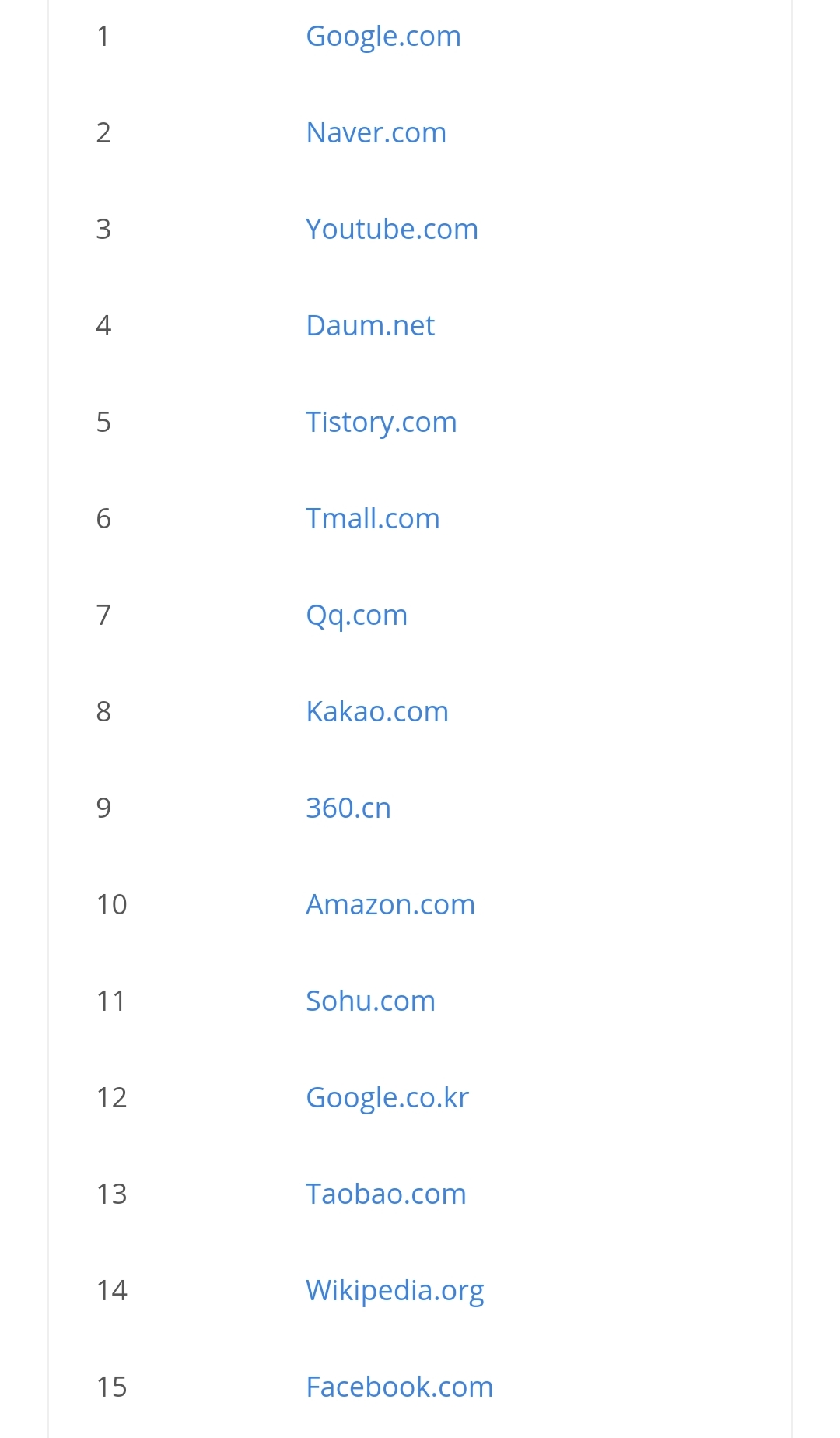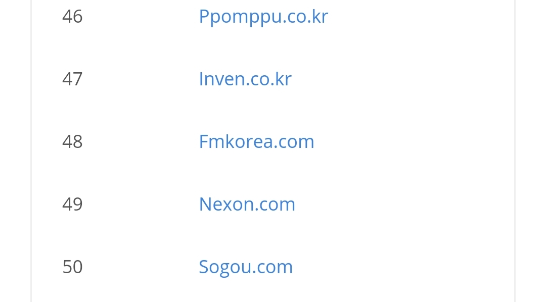 궁금해서 우리나라도 봤는데요, 왜 이렇게 중국사이트가 많죠? 그렇게 많이 이용할 리가 없을 텐데.. 큐큐가 카카오보다 높을 리가 없쟎아요! 구글 한국보다 360과 소후가 높을 리가 없죠! 나무위키보다 타오바오가 높다니 말도 안 돼! 쿠팡보다 바이두가 위라고? ㅡ.ㅡ