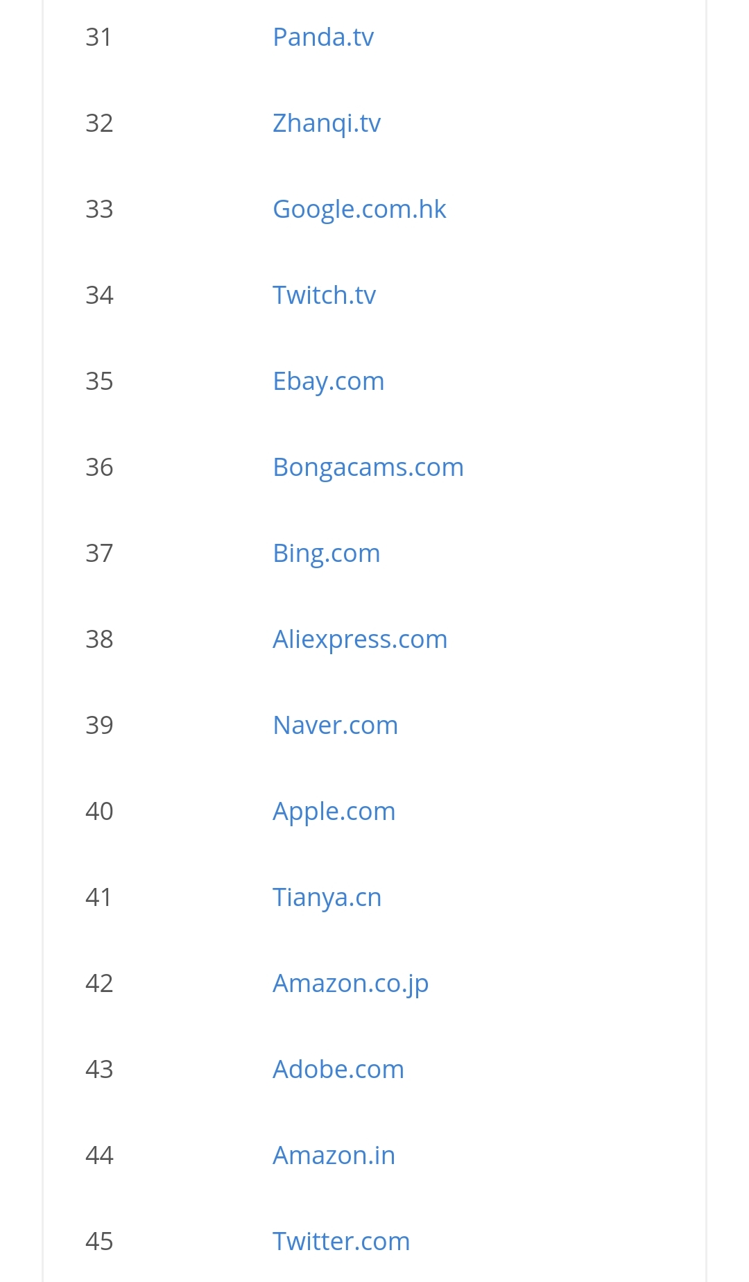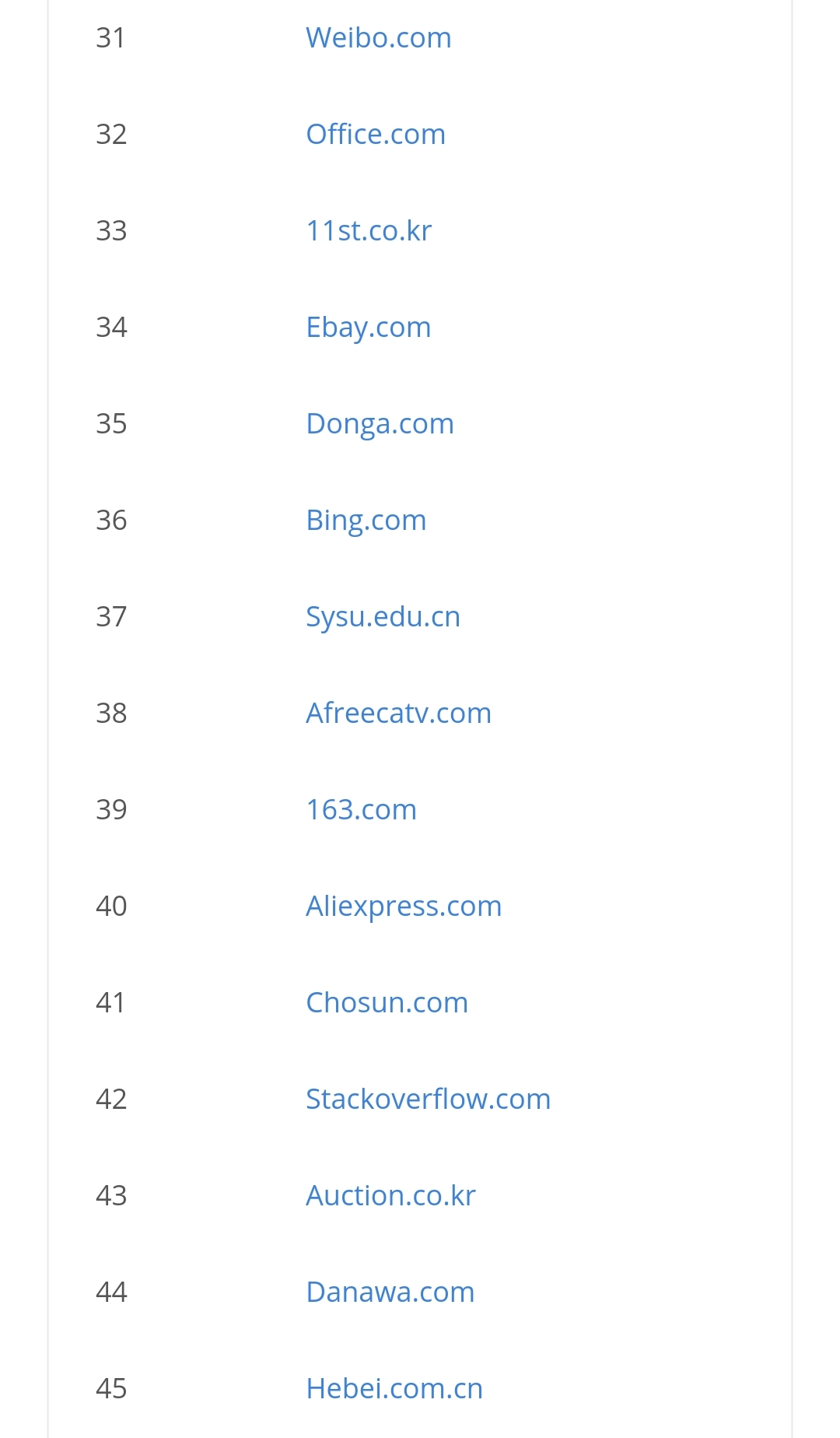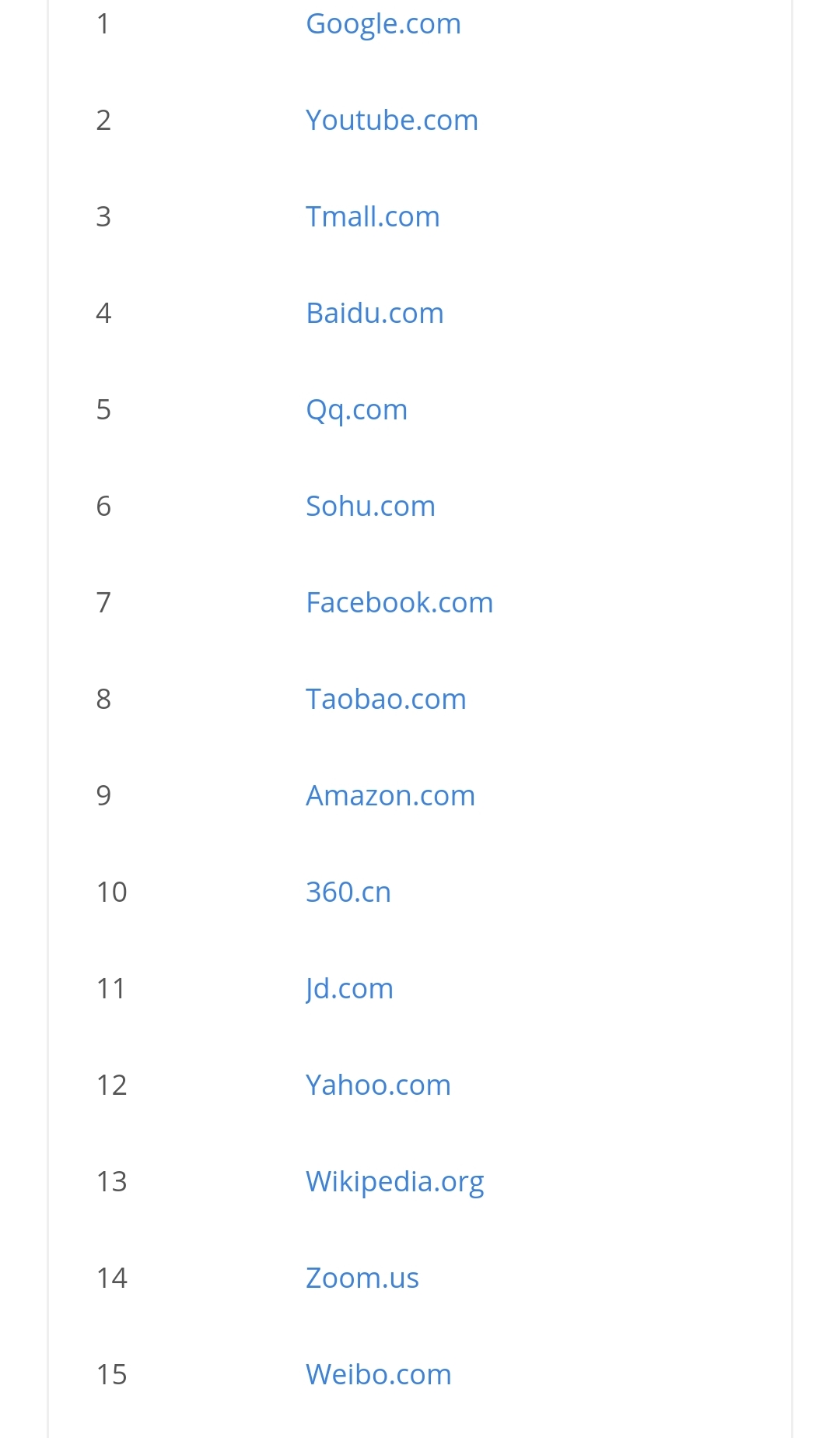 궁금해서 우리나라도 봤는데요, 왜 이렇게 중국사이트가 많죠? 그렇게 많이 이용할 리가 없을 텐데.. 큐큐가 카카오보다 높을 리가 없쟎아요! 구글 한국보다 360과 소후가 높을 리가 없죠! 나무위키보다 타오바오가 높다니 말도 안 돼! 쿠팡보다 바이두가 위라고? ㅡ.ㅡ