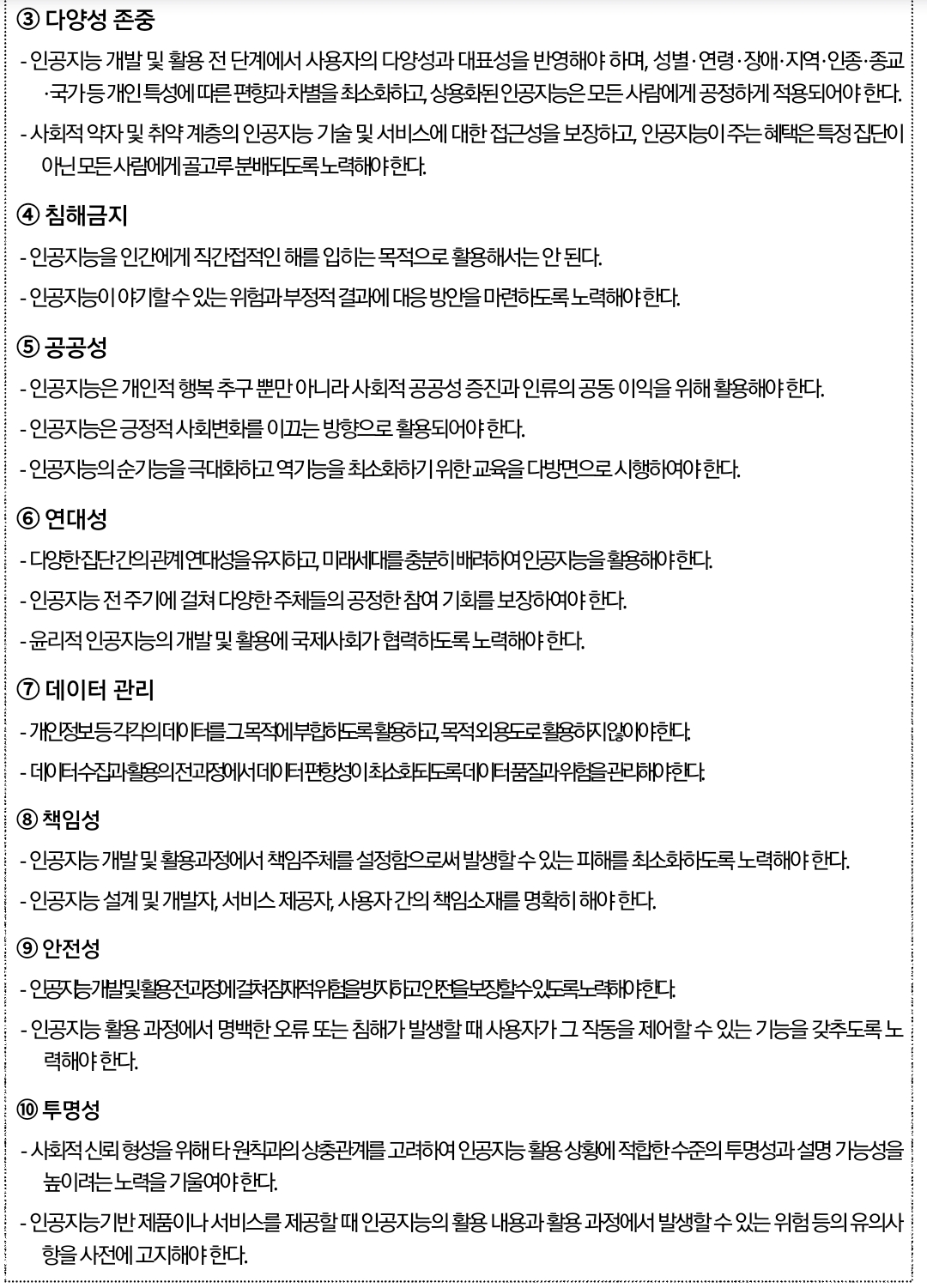 본 윤리기준에서 제시하는 원칙과 요건들은 상황에 따라 상충관계가 발생할 수 있으며, 상충하는 문제의 해결 방식은 개별 맥락과 상황에 따라 달라질 수 있다. 따라서 본 윤리기준에서는 각각 원칙들 사이에 고정된 형태의 우선순위를 제시하지는 않으며, 직간접적으로 영향을 받는 이해관계자가 지속적인 토론과 숙의 과정에 참여하여 절충점과 해결 방안을 모색하도록 권유한다." - 서문에서 발췌
