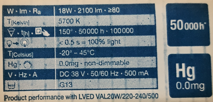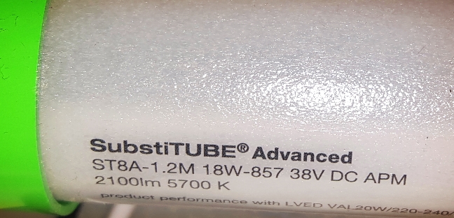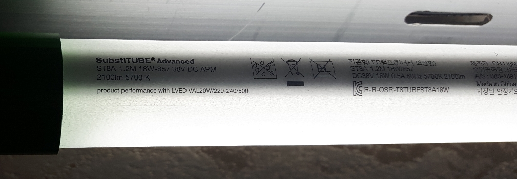 요즘 1200MM 소켓에 끼우는 직관형 형광등은, 절전형이 32와트짜리로 효율이 82~86lm/W던가 그렇고3 40와트 다 쓰는 건 총광속 4000루멘까지 있을 겁니다. 만약 36~40와트4 3000~4000루멘 형광등과 거기 딸린 40와트 전자식 안정기를 등기구에서 제거하고 이 오스람 18와트 2100루멘 엘이디형광등을 끼우면 어떠냐고 생각하는 사람이 있을지 모르겠는데, 하지 마세요. 1:1 교체는 어두워집니다. 당장 2750루멘 32와트짜리와 교체하고 나서 평가가 이렇네요. 확실히 오스람 형광등 40와트짜리가 이 오스람 엘이디 18와트짜리보다 훨씬 밝고 빛도 느낌이 좋습니다. (전기는 거의 두 배 먹긴 하지만 하루 종일 켜놓는 상업용 시설이 아닌 이상..)