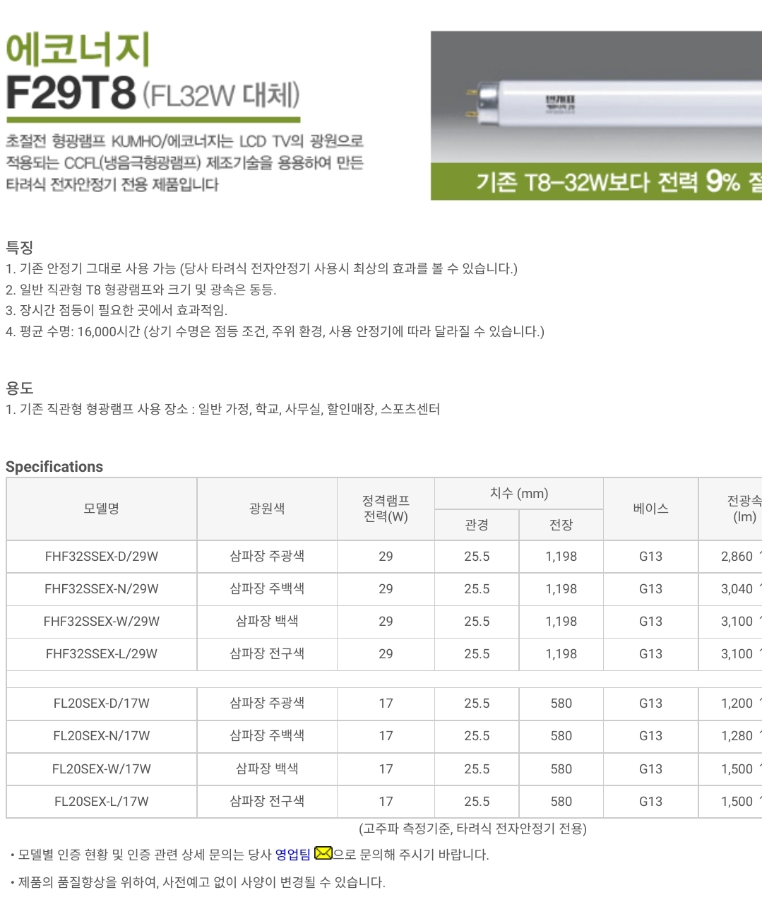 금호전기 웹사이트를 보니, 요즘 32와트 1.2미터 형광등은 3100루멘이상이라고 사양을 표시하고 있군요.