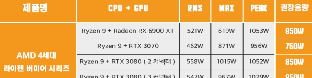 시스템 구성 몇 가지의 소비전력 RMS, MAX, PEAK가 다 적혀있고 권장하는 파워 정격용량을 적어놓은 것입니다.