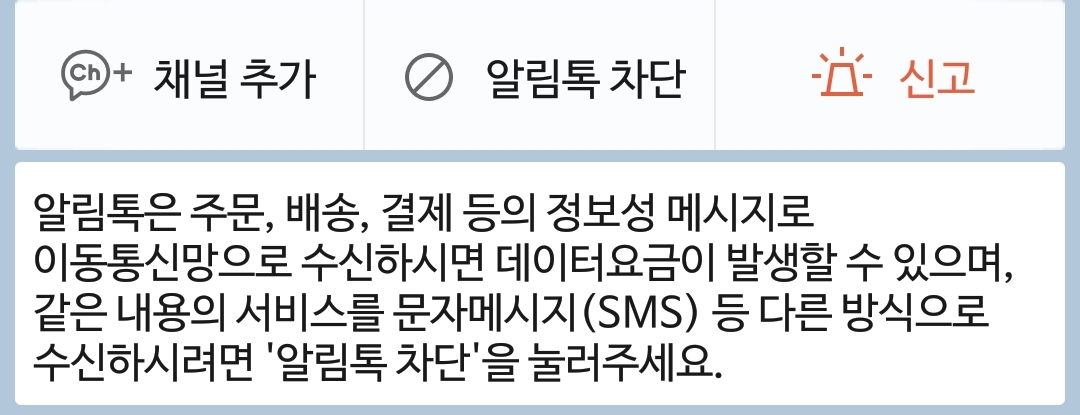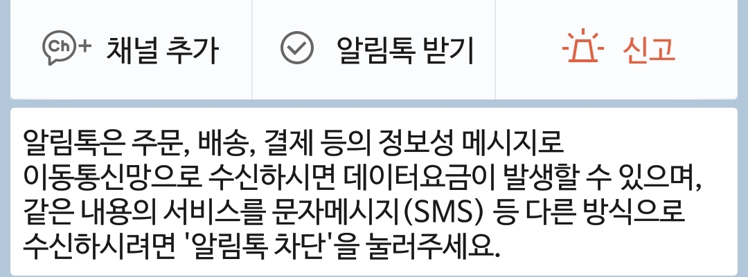 알림톡.. 아예 어떤 몰은 전화번호는 요구하지만, SMS문자알림은 안 하고 알림톡과 이메일만 선택할 수 있게 해놓기도 합니다. 카톡에 가입해 앱을 사용하고 있으면 자동검색해서 카톡으로 보내고, 카톡안쓰거나 알림톡 거부하면 텍스트 문자메시지로 보내는 모양이더군요. (알림톡을 거부할 때 문자로 보낼지 그냥 안 보낼지는 카톡이 아니라 그 몰 마음)