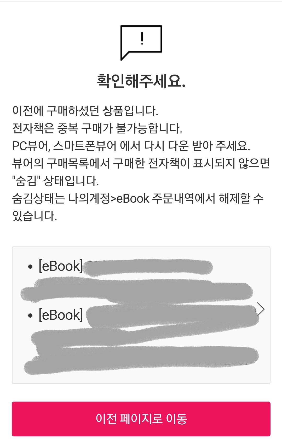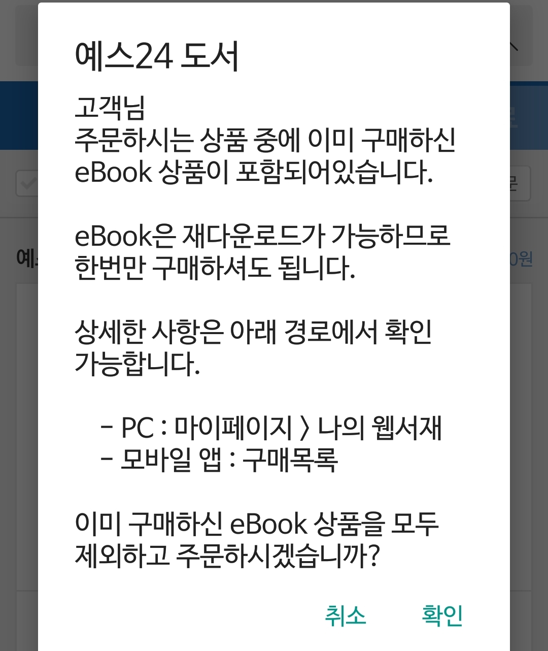 Y온라인서점과 A온라인서점 앱의 전자책 중복구매시 표시화면 본문