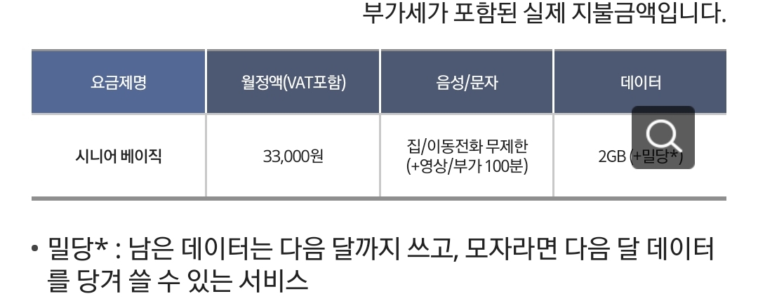 시니어베이직 요금제는 65세 이상에게 적용됩니다. 통화문자 기본제공, 영상/부가통화가 100분이고, 데이터는 2기가.