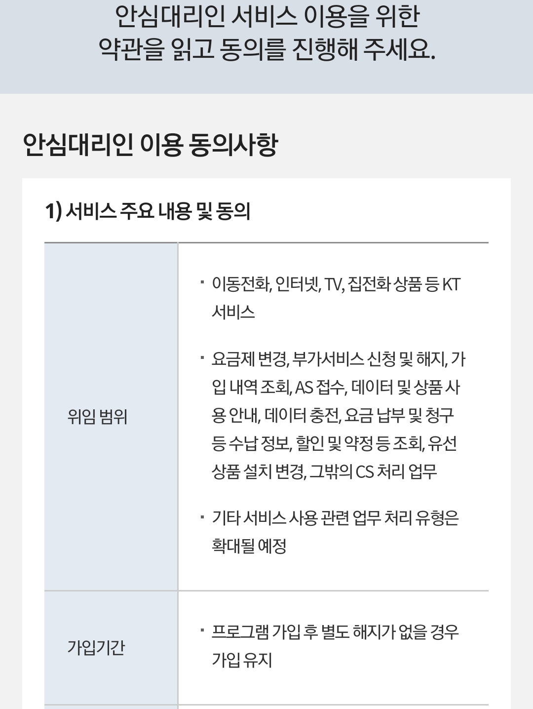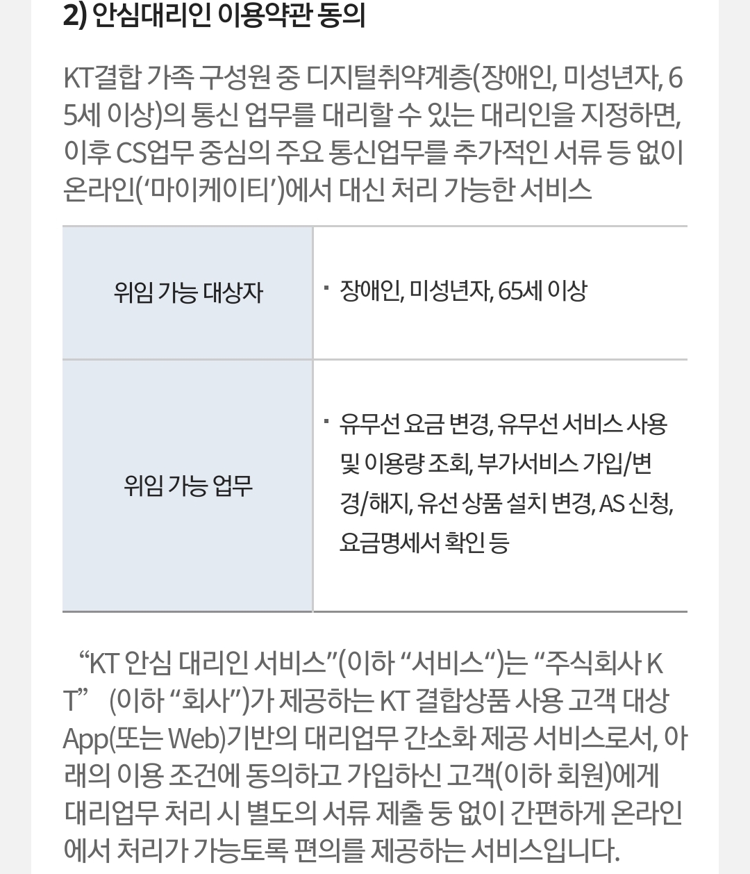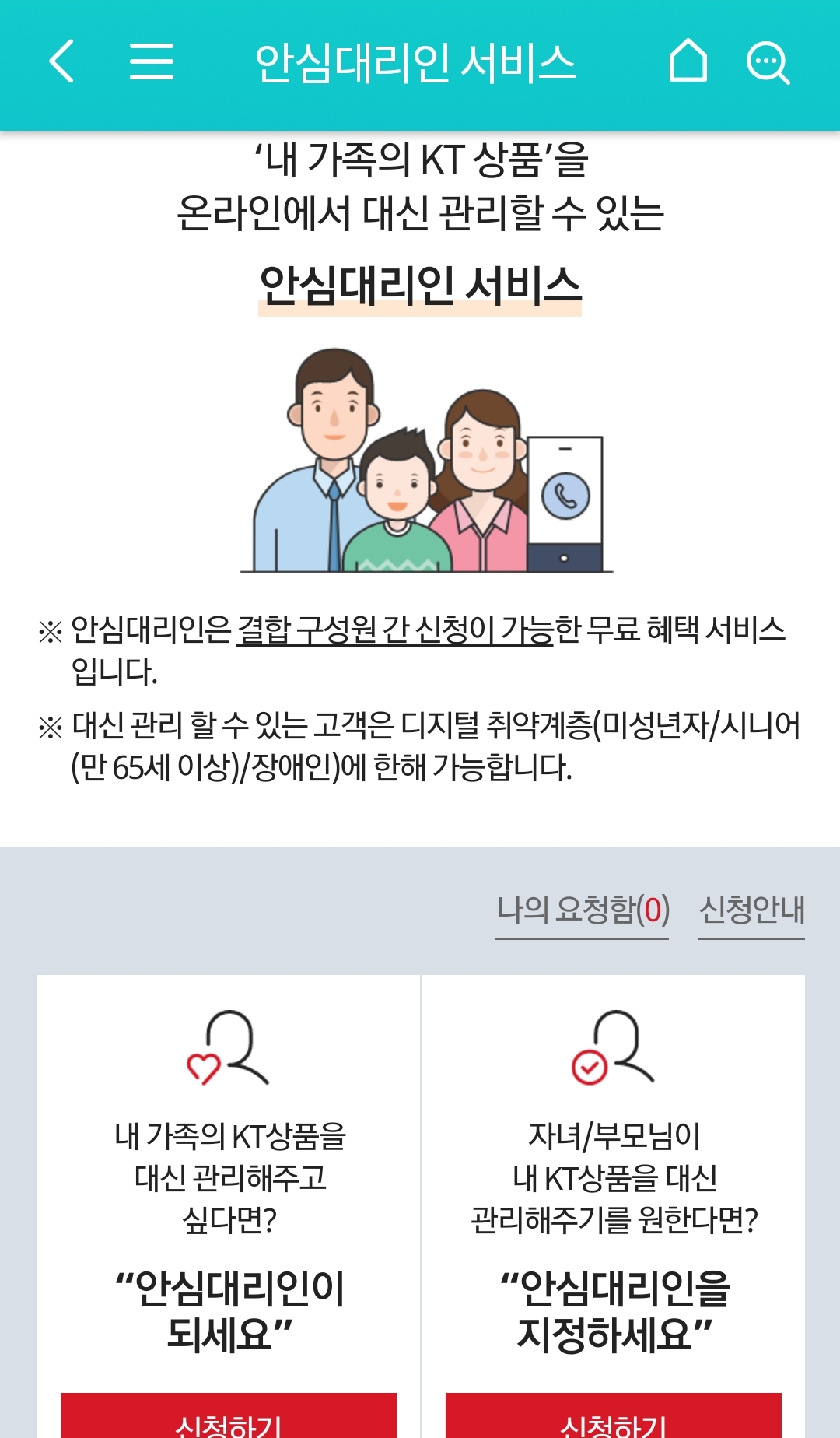 그러니까 KT서비스이용지면서 요금제할인 결합된 사이에서 이용할 수 있습니다. 또한 안심대리인에게 위임할 수 있는 계정은 디지털 취약계층(미성년자/65세 이상/장애인).