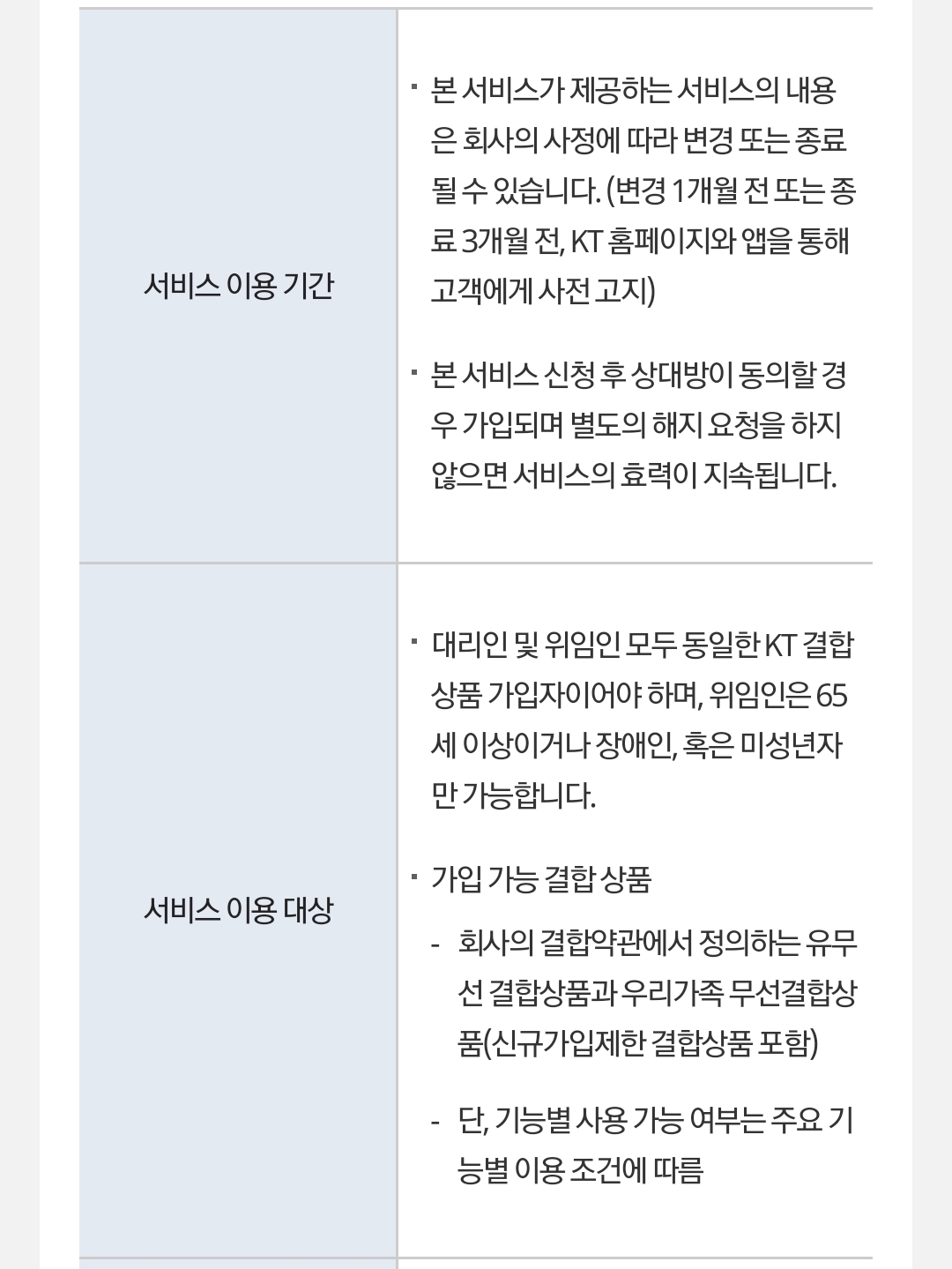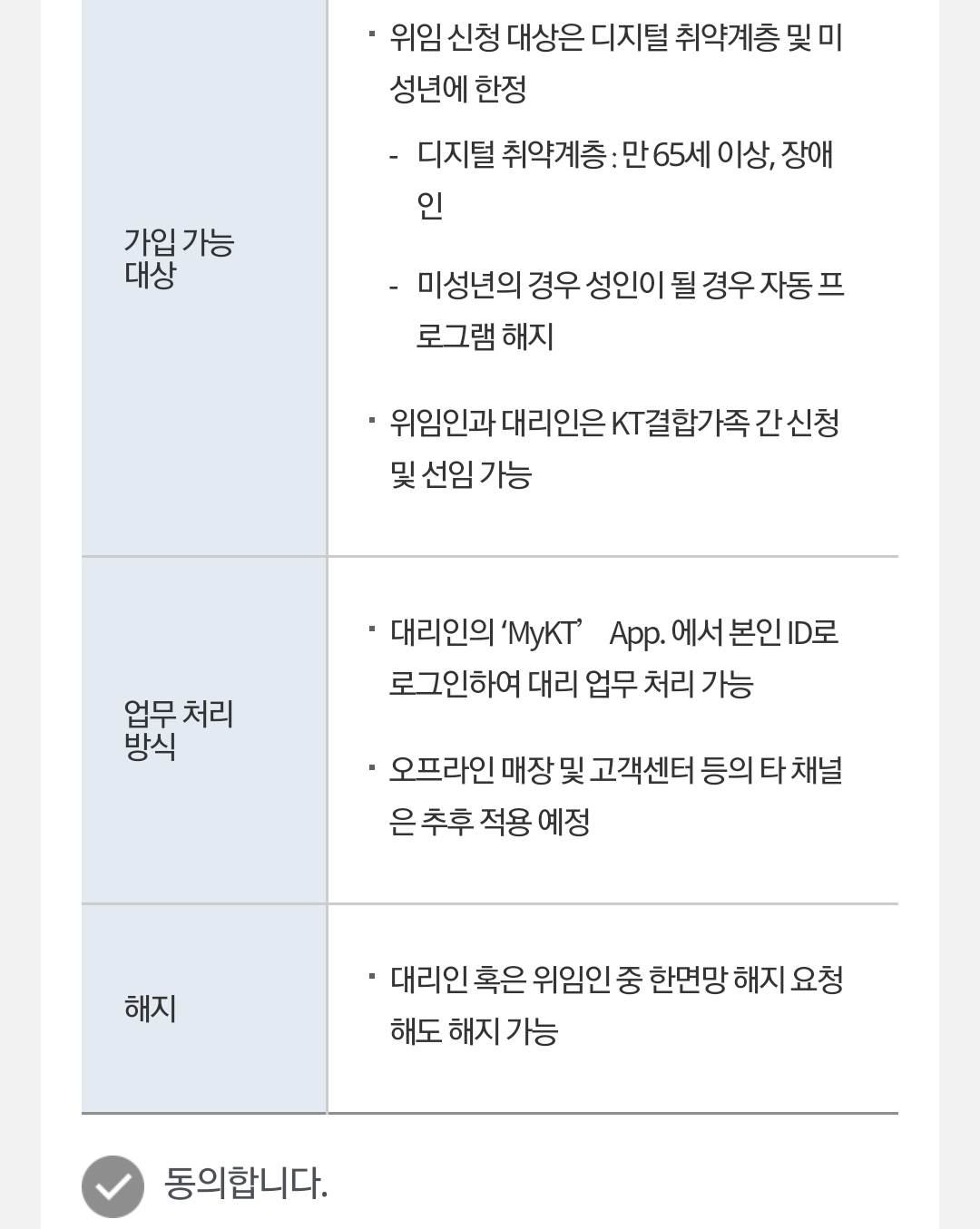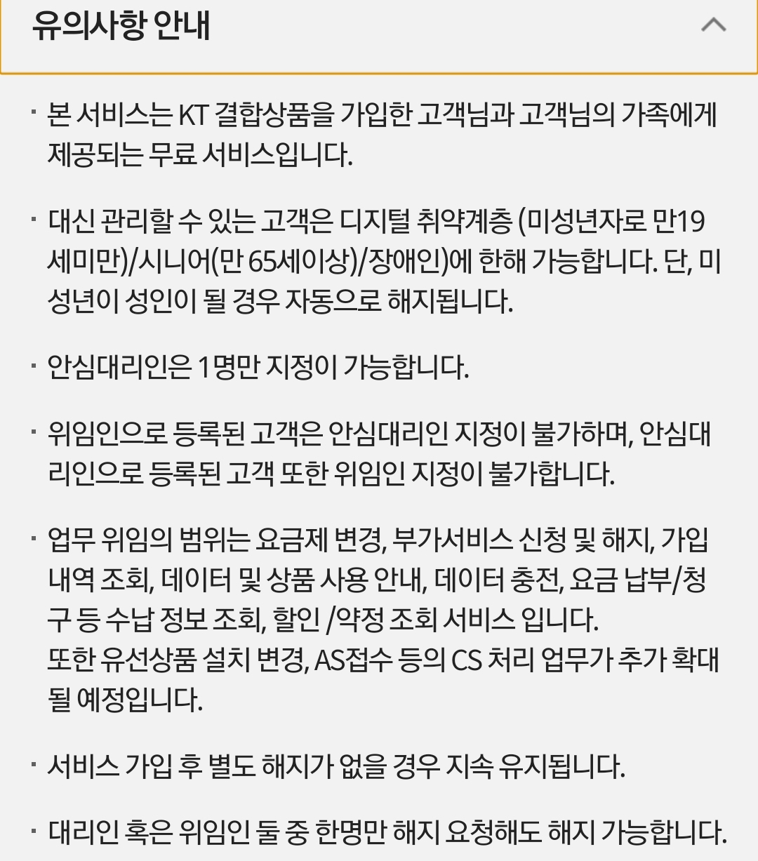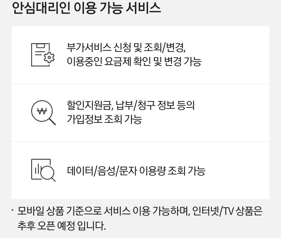 그러니까 KT서비스이용지면서 요금제할인 결합된 사이에서 이용할 수 있습니다. 또한 안심대리인에게 위임할 수 있는 계정은 디지털 취약계층(미성년자/65세 이상/장애인).