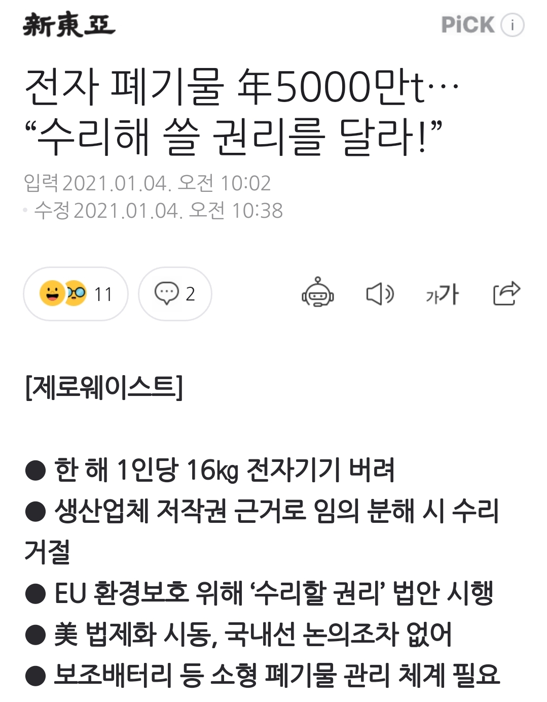 [제로웨이스트] ● 한 해 1인당 16㎏ 전자기기 버려 ● 생산업체 저작권 근거로 임의 분해 시 수리 거절 ● EU 환경보호 위해 ‘수리할 권리’ 법안 시행 ● 美 법제화 시동, 국내선 논의조차 없어