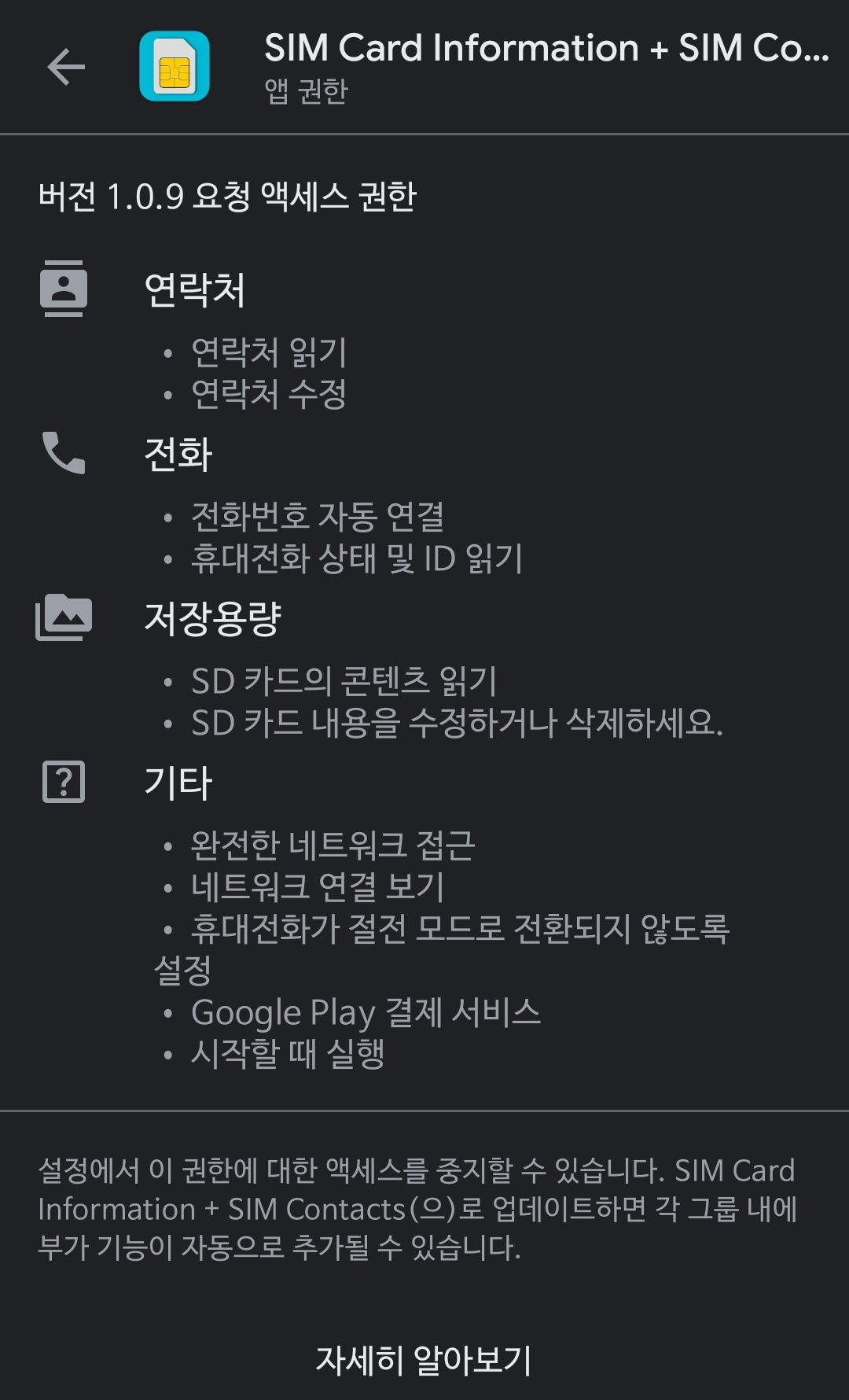 저 중에 특히, SD카드 억세스 권한은 필요할까요? 연락처 억세스는 유심카드 내 연락처를 본다는 이유로 요구하고 있기는 합니다만, 그거 안 건드리는 대신(안드로이드 기본 앱에서도 합니다) 연락처접근 권한, 적어도 수정하는 권한은 요구하지 않는 심카드 정보앱도 있습니다.