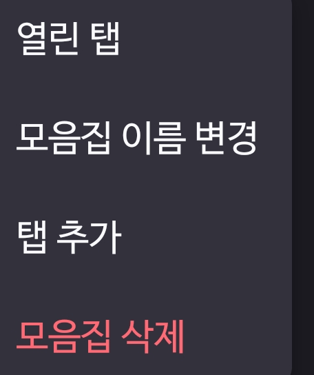 "열린 탭을 전체 선택해서 한 번에 모음집에 넣고 탭목록을 싹 지우는 기능"이 있으면 좋겠는데, 아직 구현되지 않았다. 모음집에 던져넣을 탭은 하나하나 골라줘야 한다.