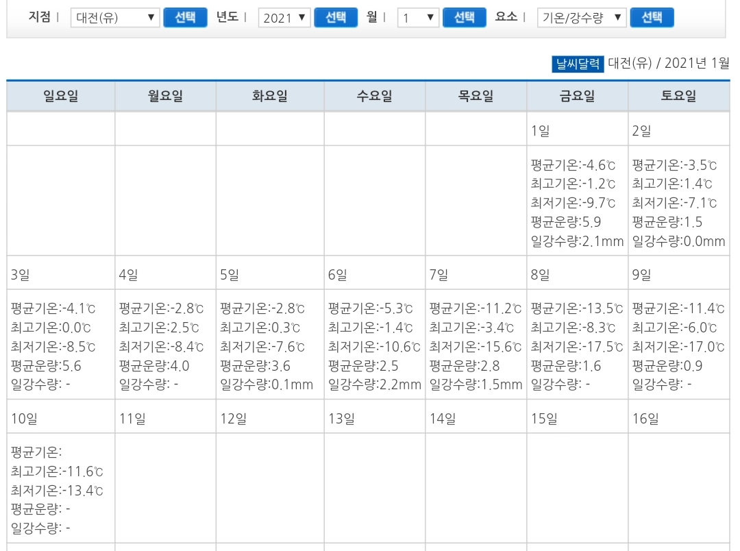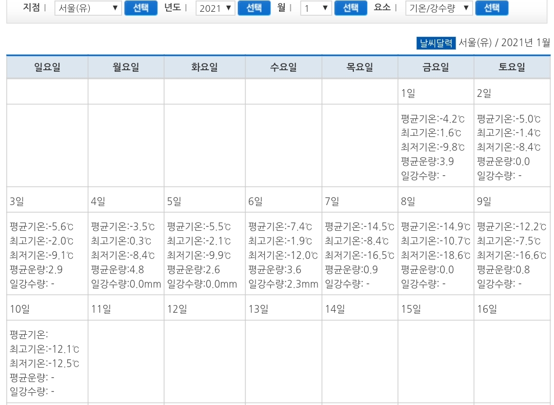 홈 > 관측자료 > 지상관측자료 > 과거자료 > 일별자료 |날씨|관측자료|지상관측자료|과거자료|일별자료 지상관측자료 과거자료 날씨달력 2021년 1월 과거 날씨 달력 일요일 월요일 화요일 수요일