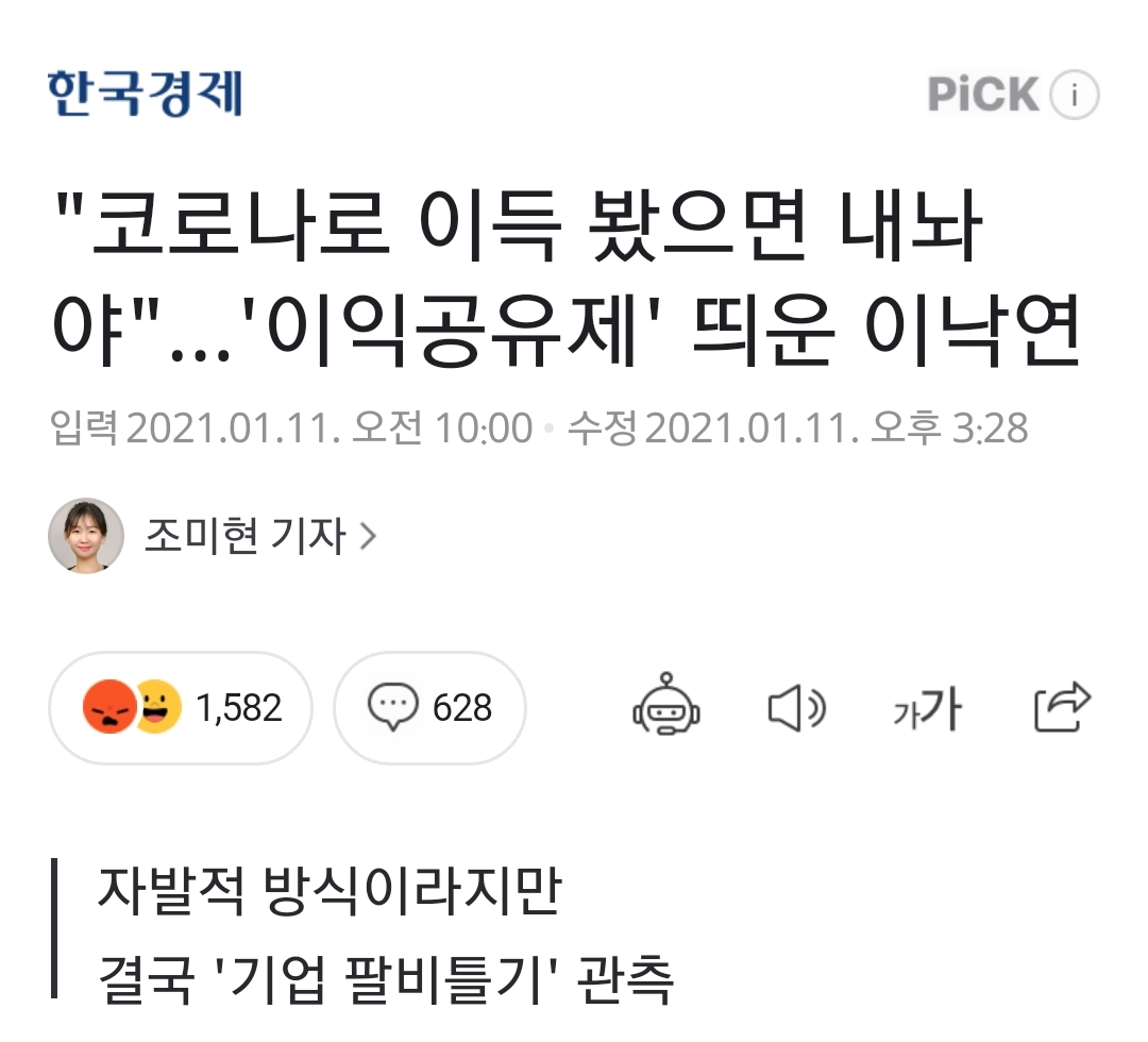 이낙연 더불어민주당 대표가 코로나19로 이익을 본 계층과 업종이 사회적 책임을 다해야 한다며 '코로나 이익공유제'를 언급했다. 자발적 방식이라고 하지만 일부 고소득층과 기업에 부담을 지