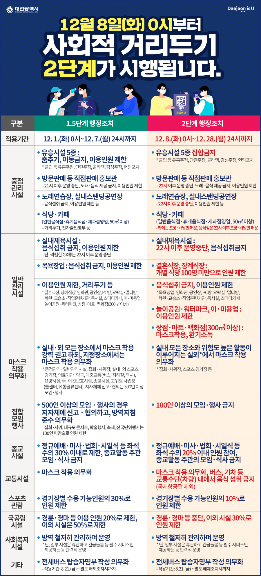 이었는데, 연말에 3단계격상대신 "강화된 단계"라며 추가 시행된 정부 조치 후로 어떻게 됐는지는 각 지자체에 알아봐야 확실할 듯. 그 전에 2단계였던 지역이든 2.5단계였던 지역이든 그 '강화된 단계'가 아직 풀리지 않은 상태다.