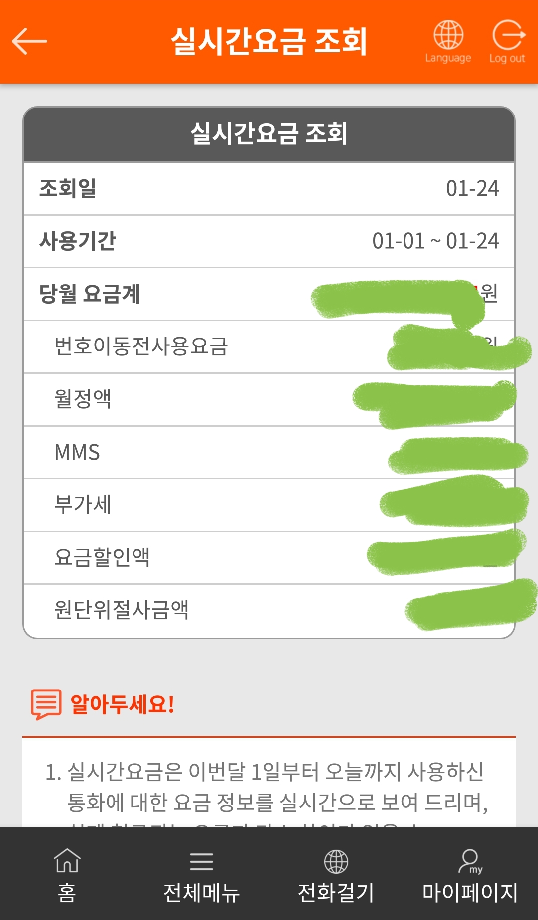프리텔레콤앱의 실시간 요금조회화면 본문