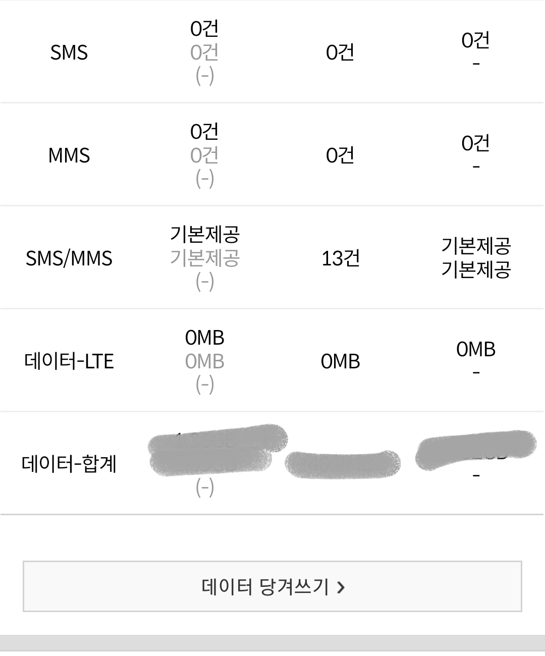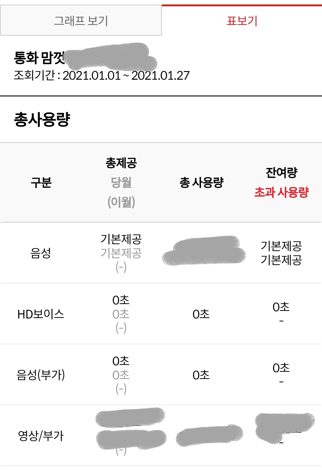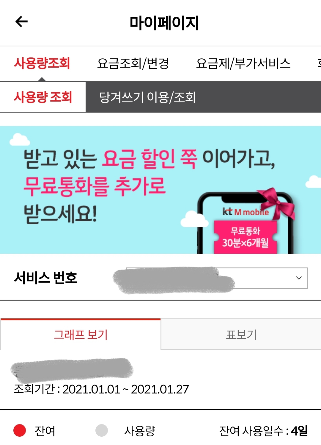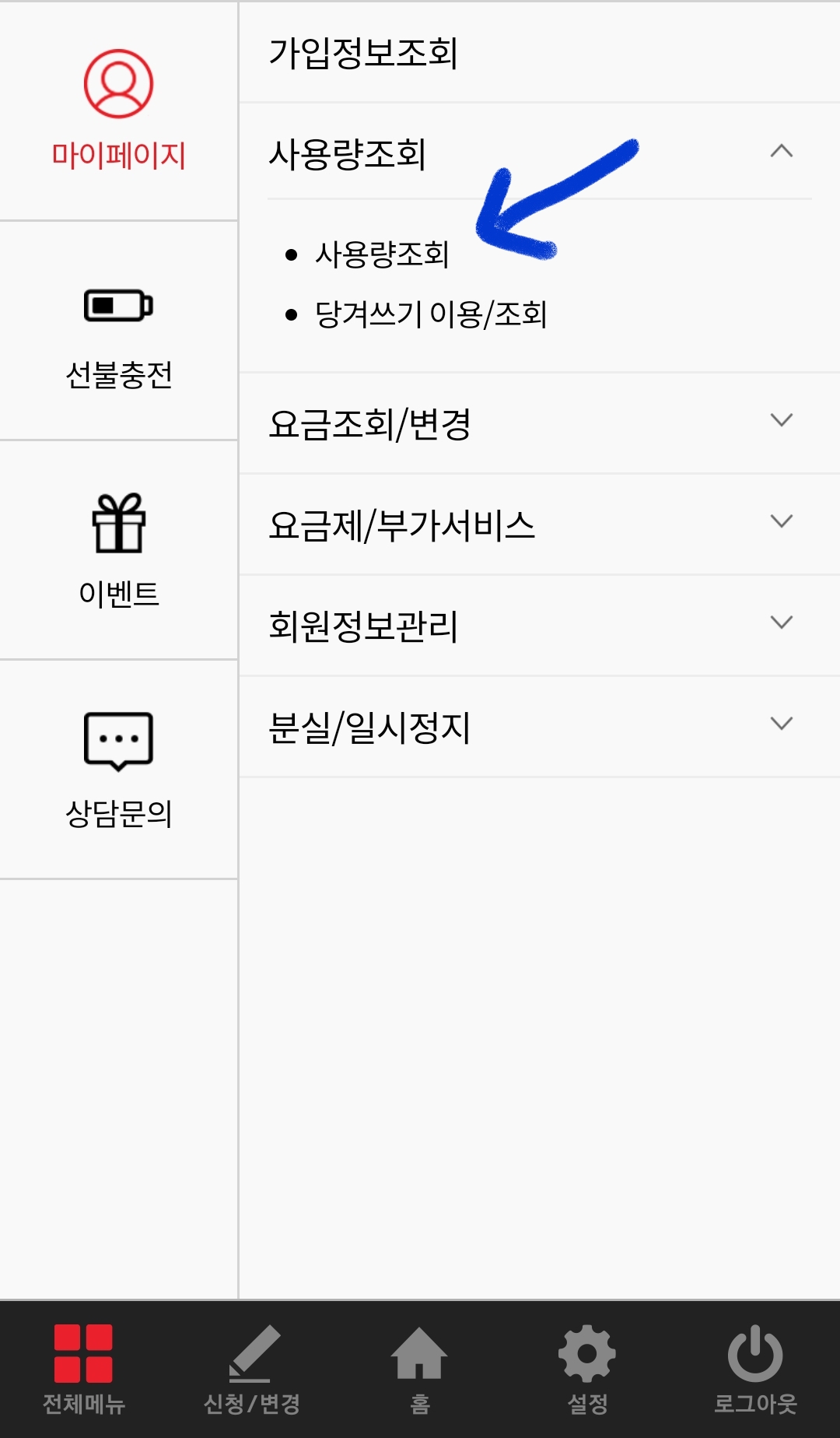 홈화면의 요약 파이차트(원그래프) 오른쪽 아래 구석에 보이는 (+)표를 눌러도 되고, 화면 하단 아래 메뉴버튼을 눌러 마이페이지> 사용량조회로 들어가도 됩니다.