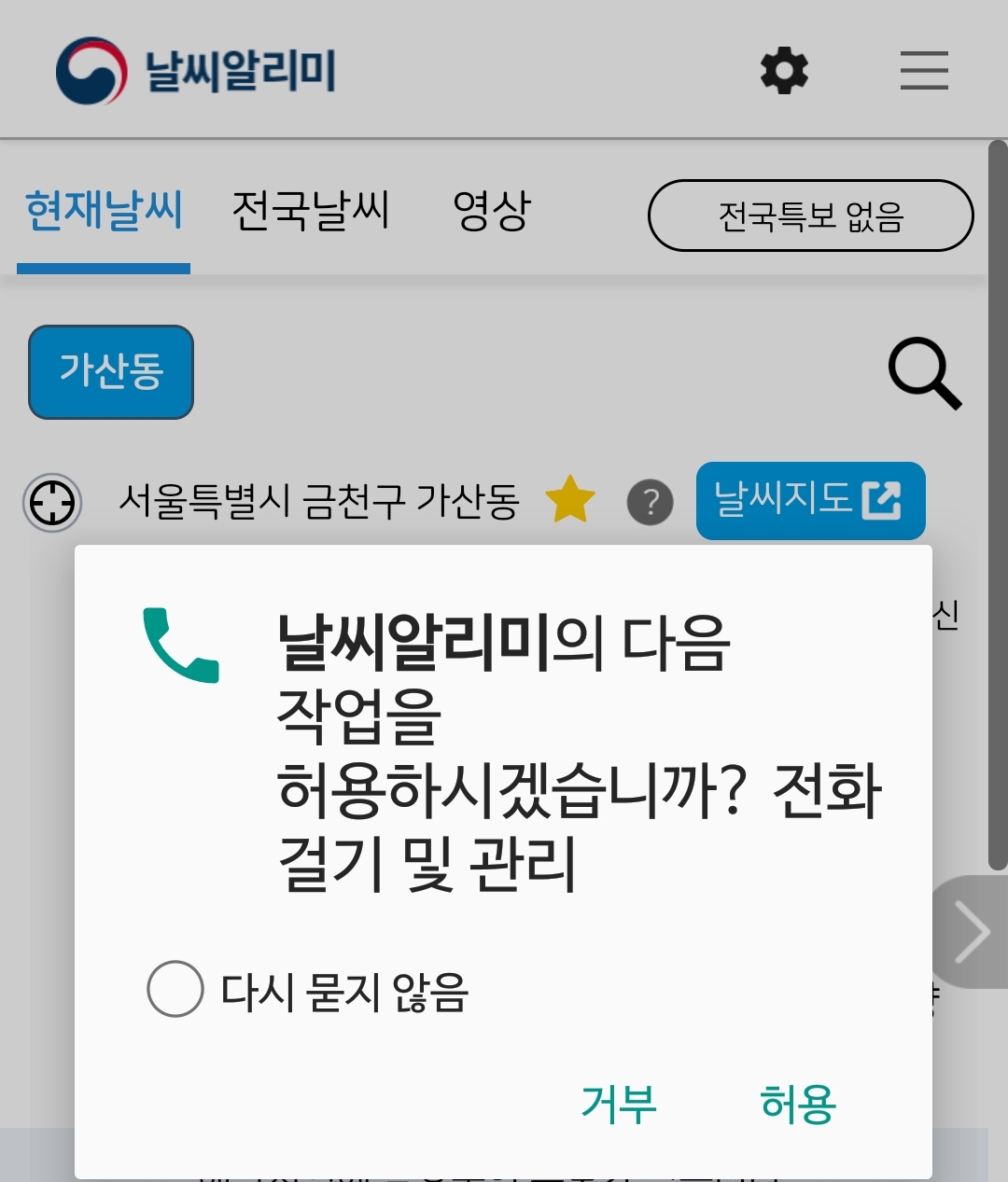 ※ 민간앱 중 케이웨더앱은 전화걸기권한을 요구하지 않고 관심지역을 저장할 수 있습니다.