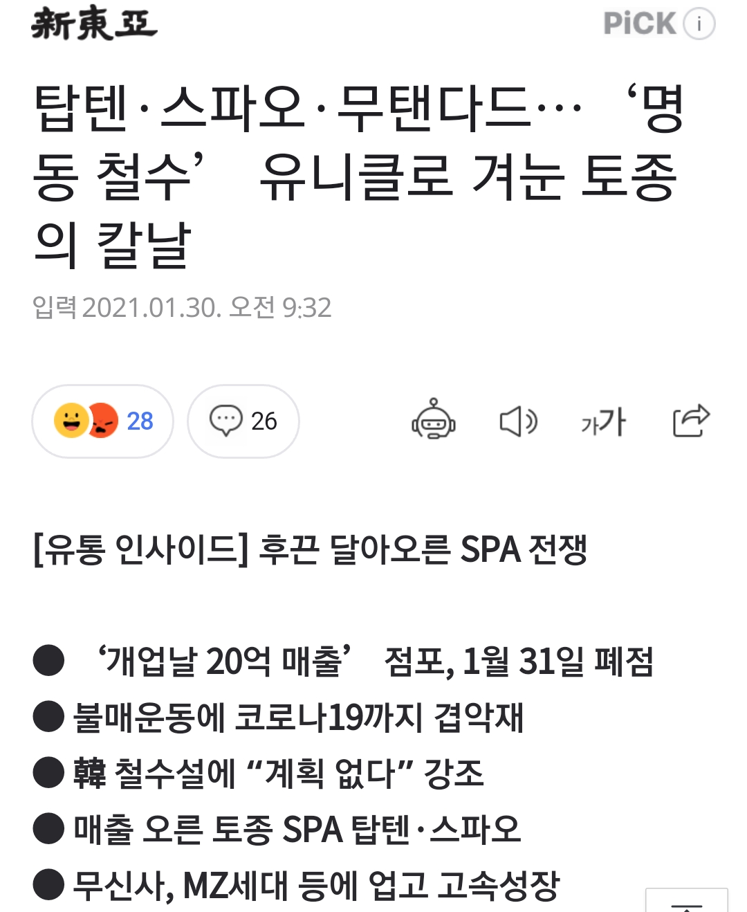 [유통 인사이드] 후끈 달아오른 SPA 전쟁 ● ‘개업날 20억 매출’ 점포, 1월 31일 폐점 ● 불매운동에 코로나19까지 겹악재 ● 韓 철수설에 “계획 없다” 강조 ● 매출 오른 토종 SPA 탑텐·스파오