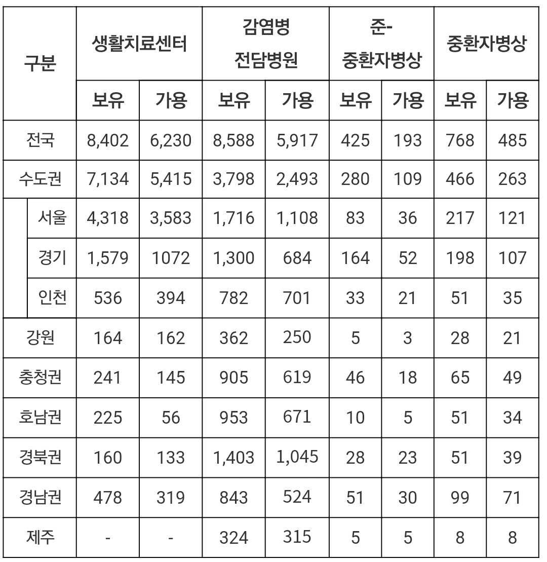 코로나19 집계(2021.2.3 0:00 기준), 전국 환자수용시설과 병상 현황 본문