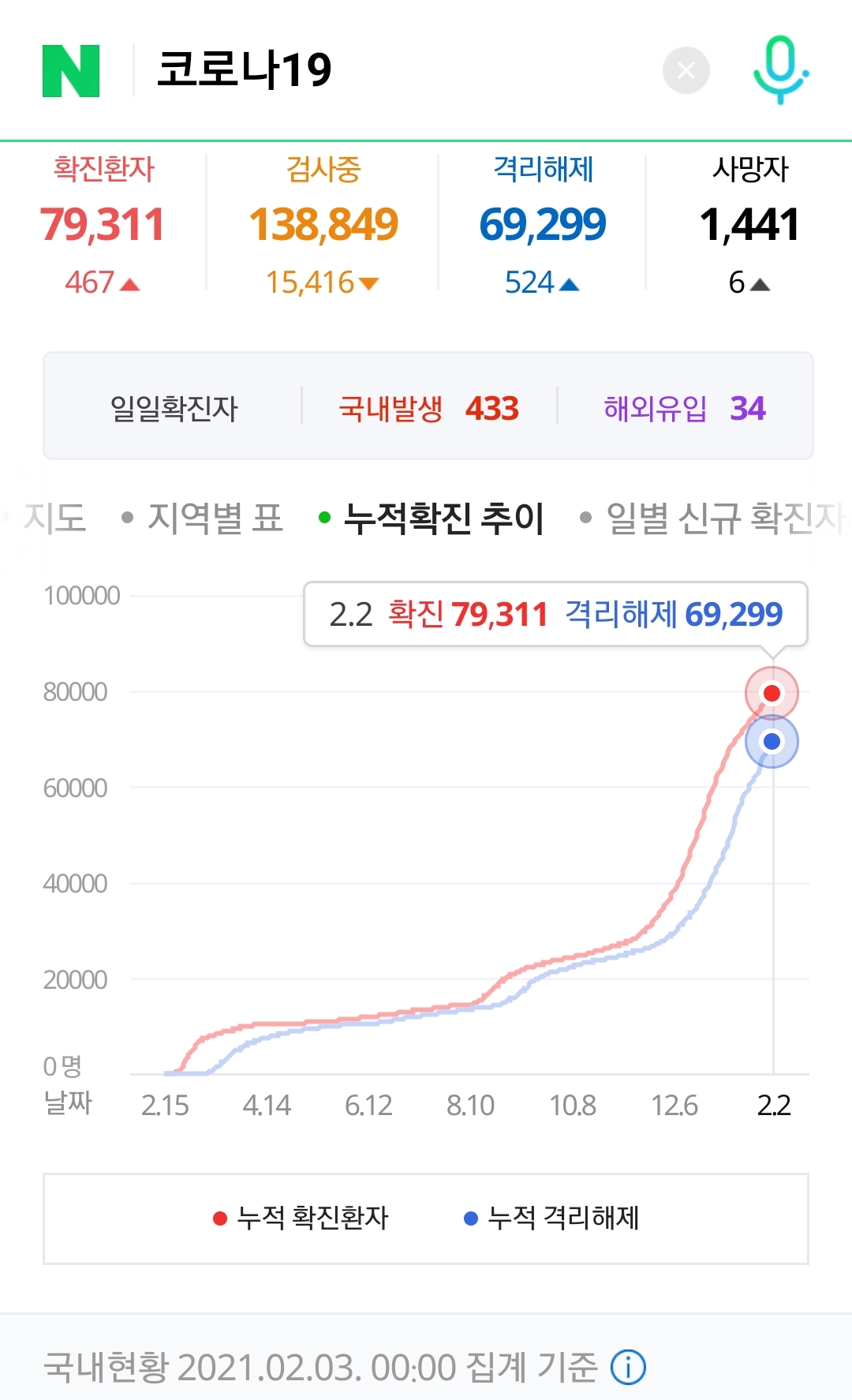 | 코로나19 집계(2021.2.2 0:00기준) (0) | 2021.02.02 |