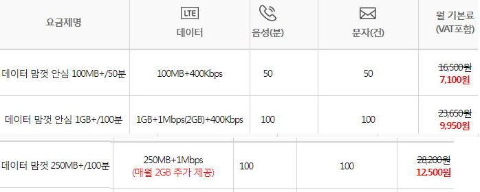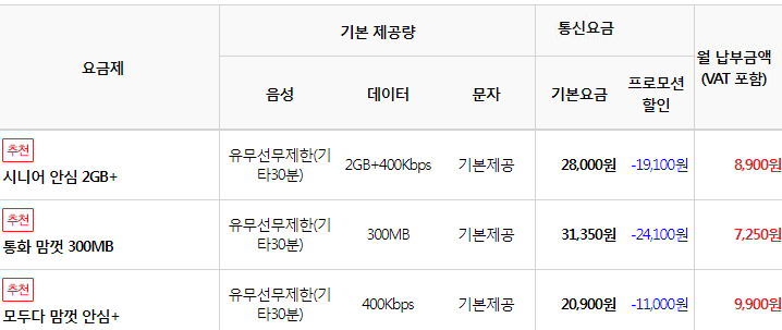일단 음성문자 무제한요금제먼저.. 셋 다 부가통화(15xx, 16xx 등)제공량은 30분입니다.