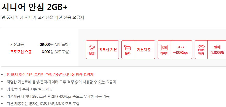 이름대로 만 65세 이상만 가입 가능합니다. 어르신들은 아무래도 음성통화위주니까.