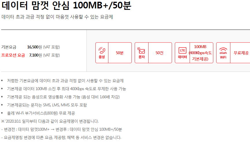 400kbps QoS가 있고, 음성50분, 문자50분입니다. 6100원이었다가 몇 달 전에 7100원이 됐는데, 다른 통신사에선 찾아보기 힘들어 아직 가치가 있는 요금제죠. 제가 써봤을 때는 240p화질로 유튜브시청가능했습니다. 정책으로 막지 않는다면 될 듯. 그런데 넷플릭스나 유튜브 돈내고 구독하는 분들이라면 이 요금제를 쓸 분은 없겠죠?