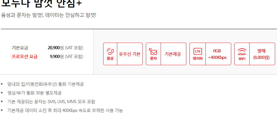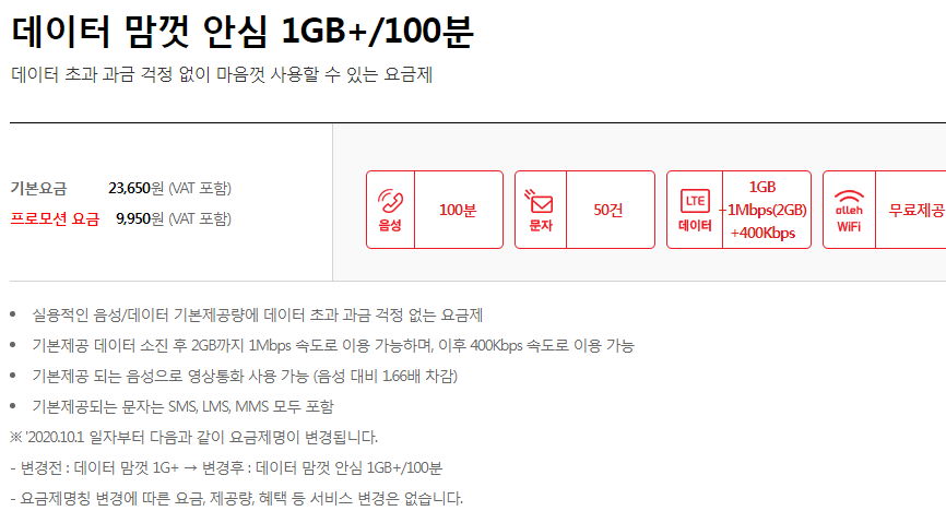음성100분, 문자 100건. 데이터는 1GB주고, 1Mbps로 2GB주고, 그 다음에는 400kbps QoS.