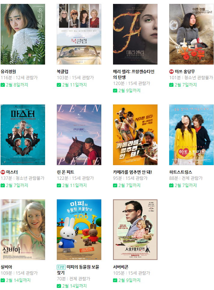 유리정원, 북클럽, 메리 셸리: 프랑켄슈타인의 탄생, 미쓰 홍당무, 마스터, 린 온 피트, 카메라를 멈추면 안 돼!, 하트스트링스, 실비아, 미피의 동물원 보물찾기, 서버비콘