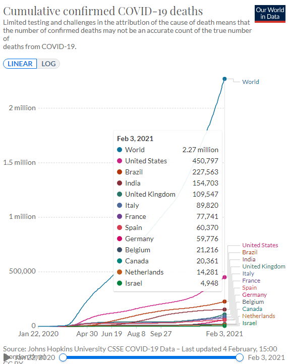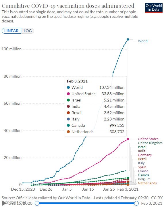2달도 안 돼서 1억 명 접종.. 이번 질병이 과학기술의 발달덕분에 인류 역사상 처음으로 "통제된 유행"이 될 거라는 전망이 작년에 나온 적 있었죠. 그래도 이미 2백만 명이 넘는 희생자가 나왔습니다. 이대로 백신접종이 전세계적으로 이루어지고, 변종에 대한 대응이 되고, 바이러스도 더 빨리 치사율이 낮게 변이하면, 전체 예상 희생자는 백 년 전 스페인독감때와 비교해 매우 적을 것 같지만.