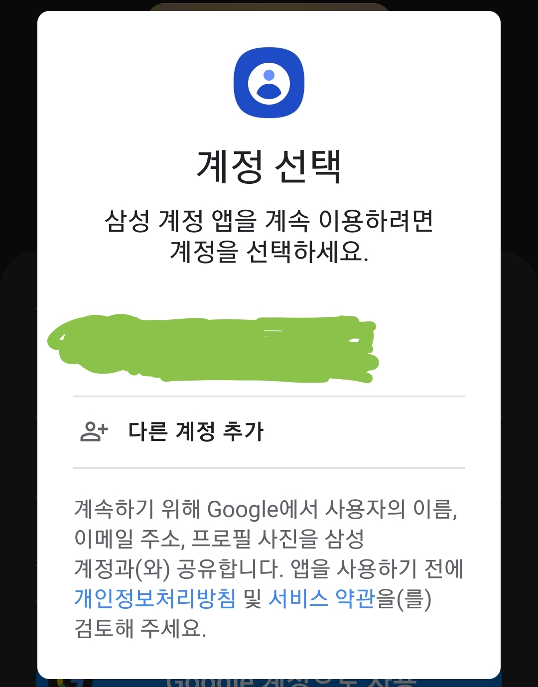 구글 계정을 고를 수 있습니다. 기본값은 지금 전화기에 등록된 구글 계정(지메일, 플레이스토어, 크롬 웹브라우저 등에 적용되는)인데, 다른 구글계정(gmail.com계정)을 입력해줄 수도 있는 모양입니다.