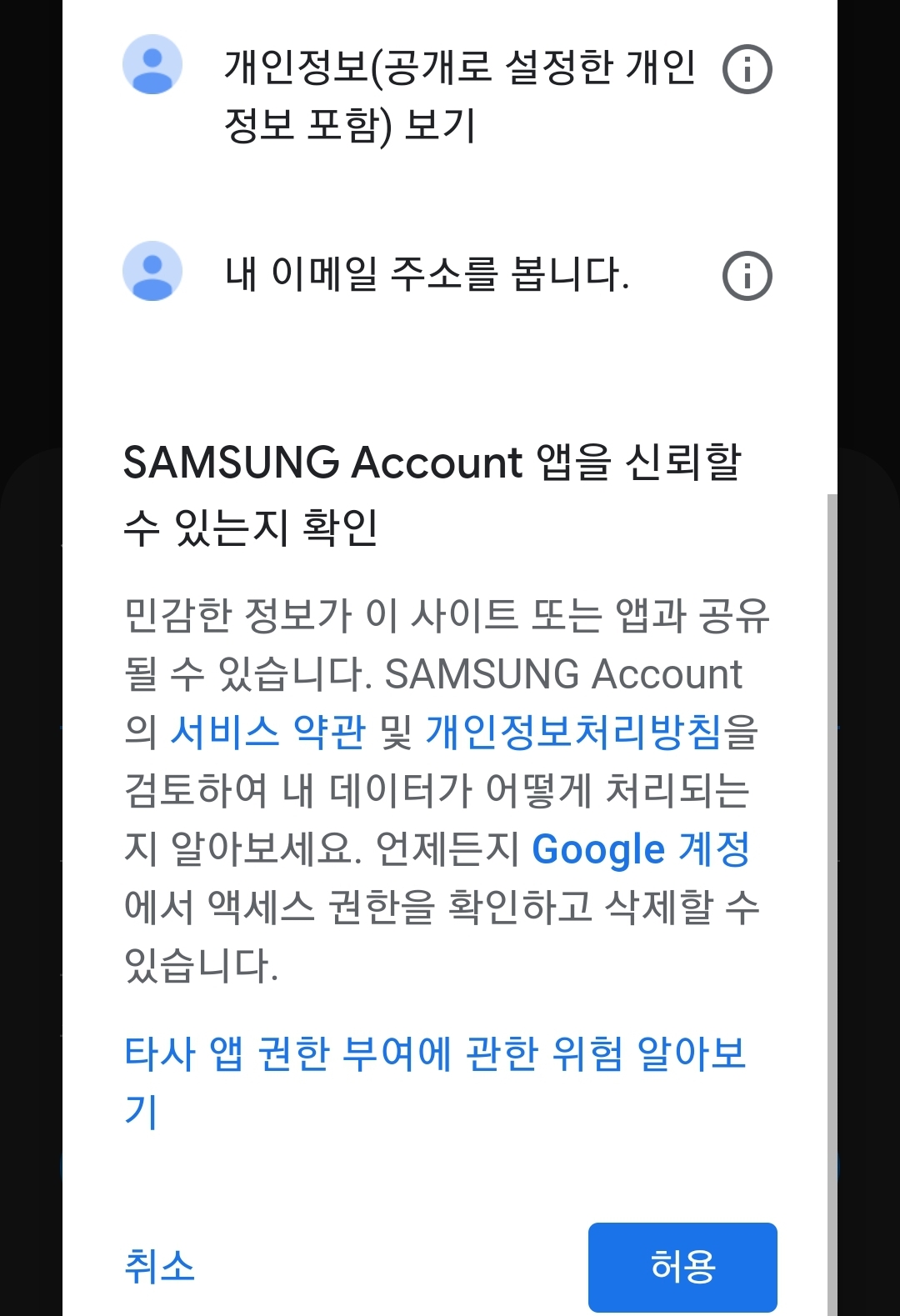 그러면 구글쪽에서, 다른 서비스가 이런 정보를 요구한다며 알려오죠. 네이버, 마이크로소프트도 이런 경우에는 이런 종류 화면을 보여줍니다.
