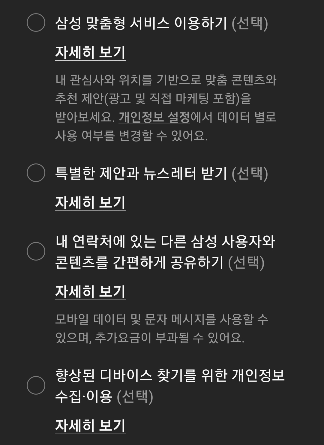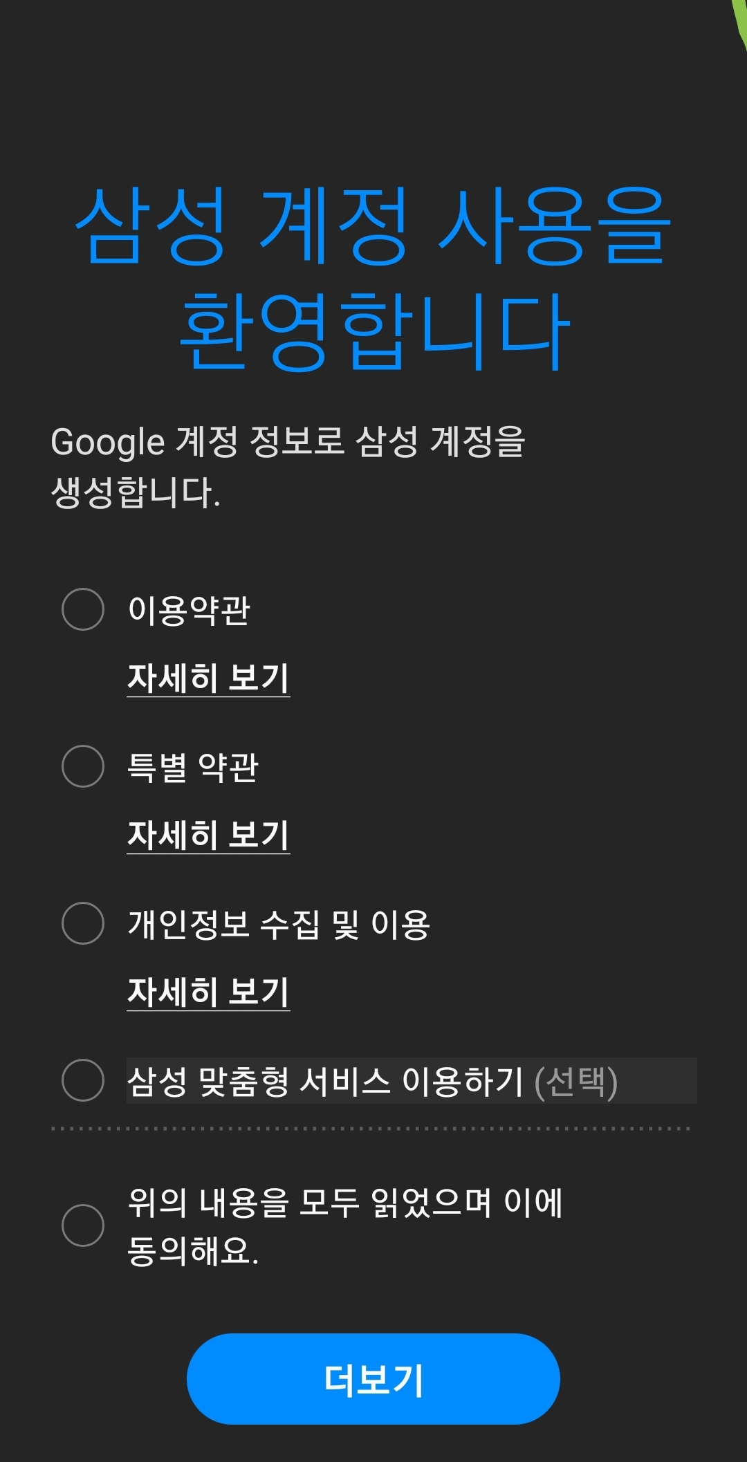 이제 삼성계정쪽 약관동의 등. 필수항목과 선택항목이 있으며, 갯수가 많아 한 화면에 다 안 나오니까 스크롤해 봐야 합니다.