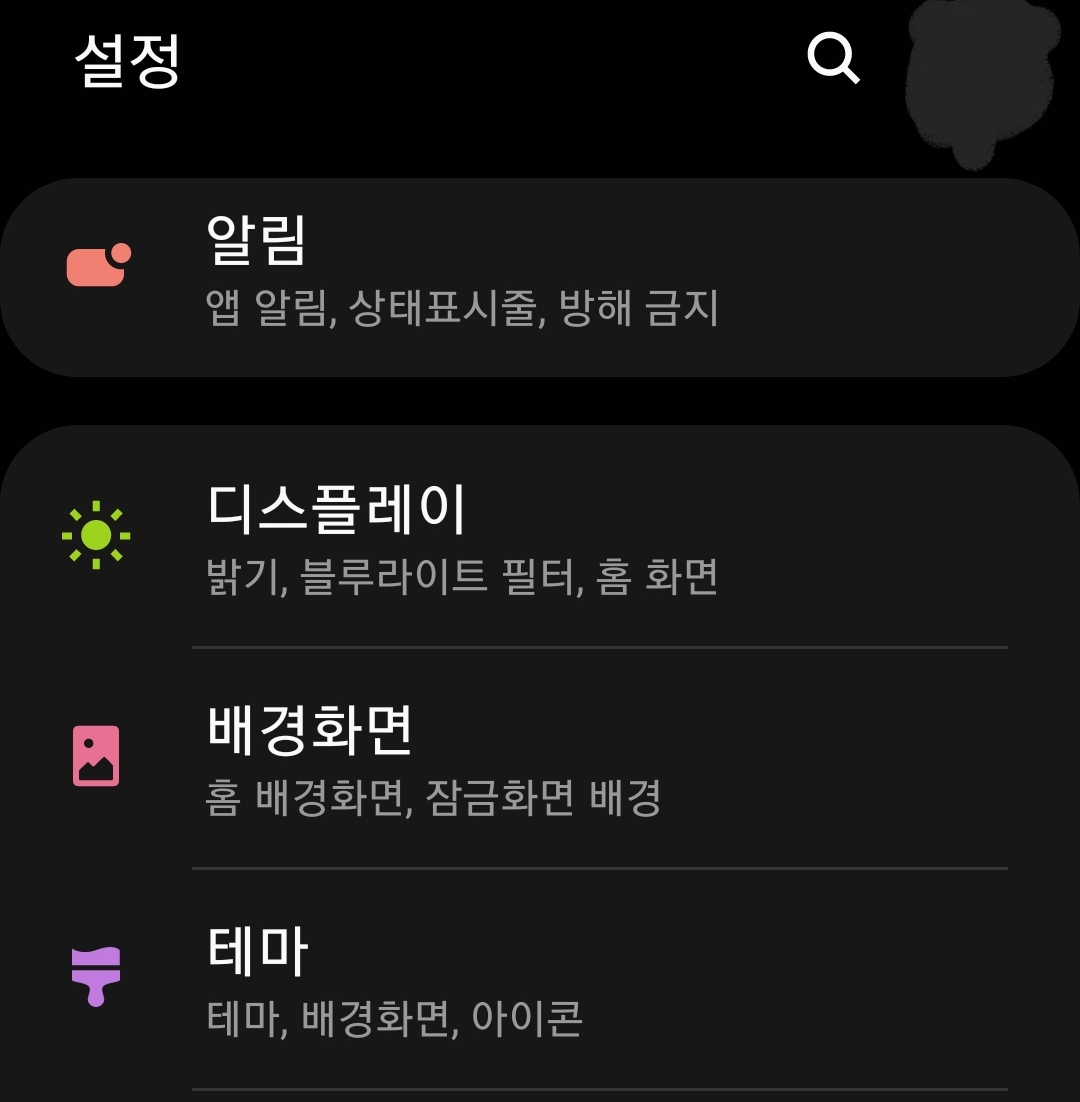 배경화면과 테마를 바꾸려면, 안드로이드OS 설정에서 테마 미뉴를 고릅니다.