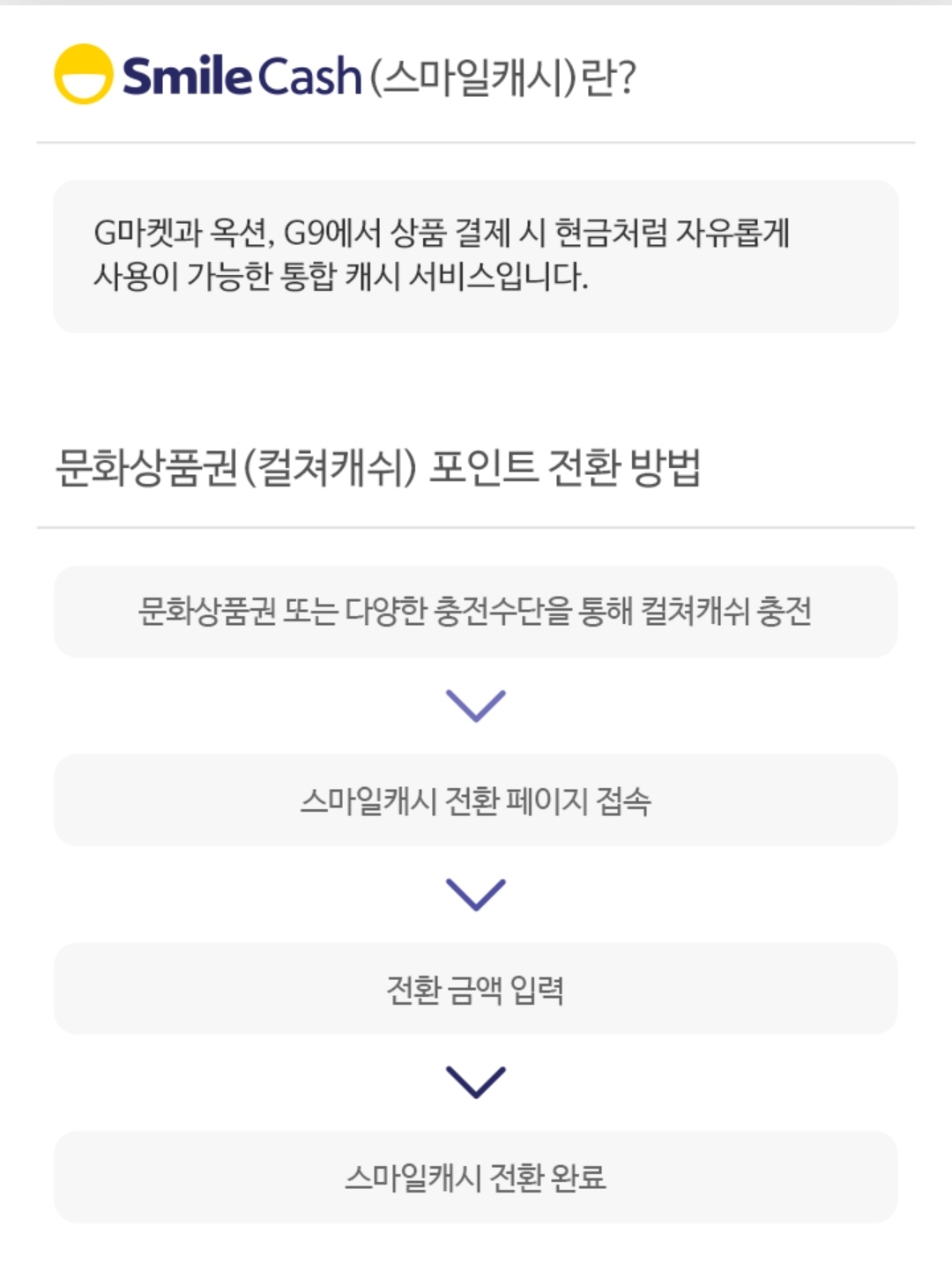 요즘은 월 5만원 한도로 수수료없이 "전환"됩니다. 옥션이나 지마켓 웹이나 앱에서 하면 되고, 그 이상은 컬쳐랜드 앱에서 메뉴를 열어 3%수수료를 차감하고 전환하면 됩니다.