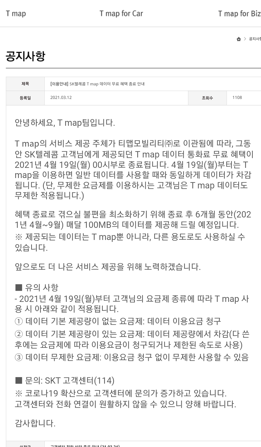 안녕하세요, T map팀입니다. T map의 서비스 제공 주체가 티맵모빌리티㈜로 이관됨에 따라, 그동안 SK텔레콤 고객님에게 제공되던 T map 데이터 통화료 무료 혜택이 2021년 4월 19일(월) 00시부로 종료