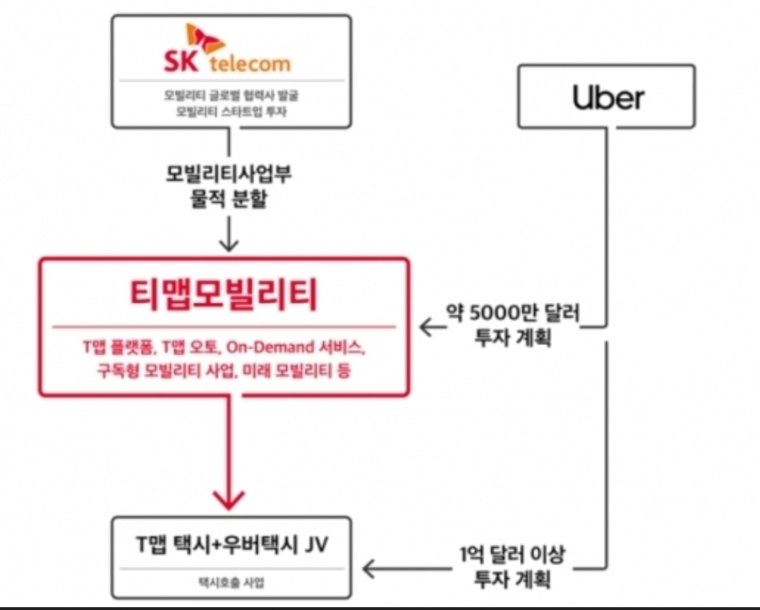 우버는 투자로 합작사지분 51%를 가지고 주도하며 별도로 티맵모빌리티[SK텔레콤에서 물적분할한 자회사)에 투자. 내달 공식 발표예정.